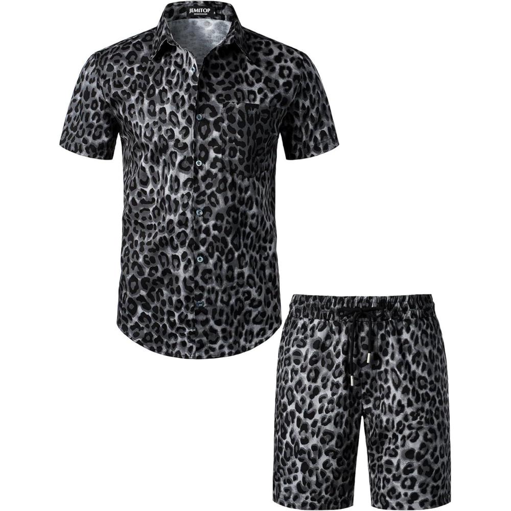 JEMITOP Men's 2 Piece Casual Cotton Stretchy Outfit Short Sleeve Button up Shirt and Shorts Set(Black Leopard)
