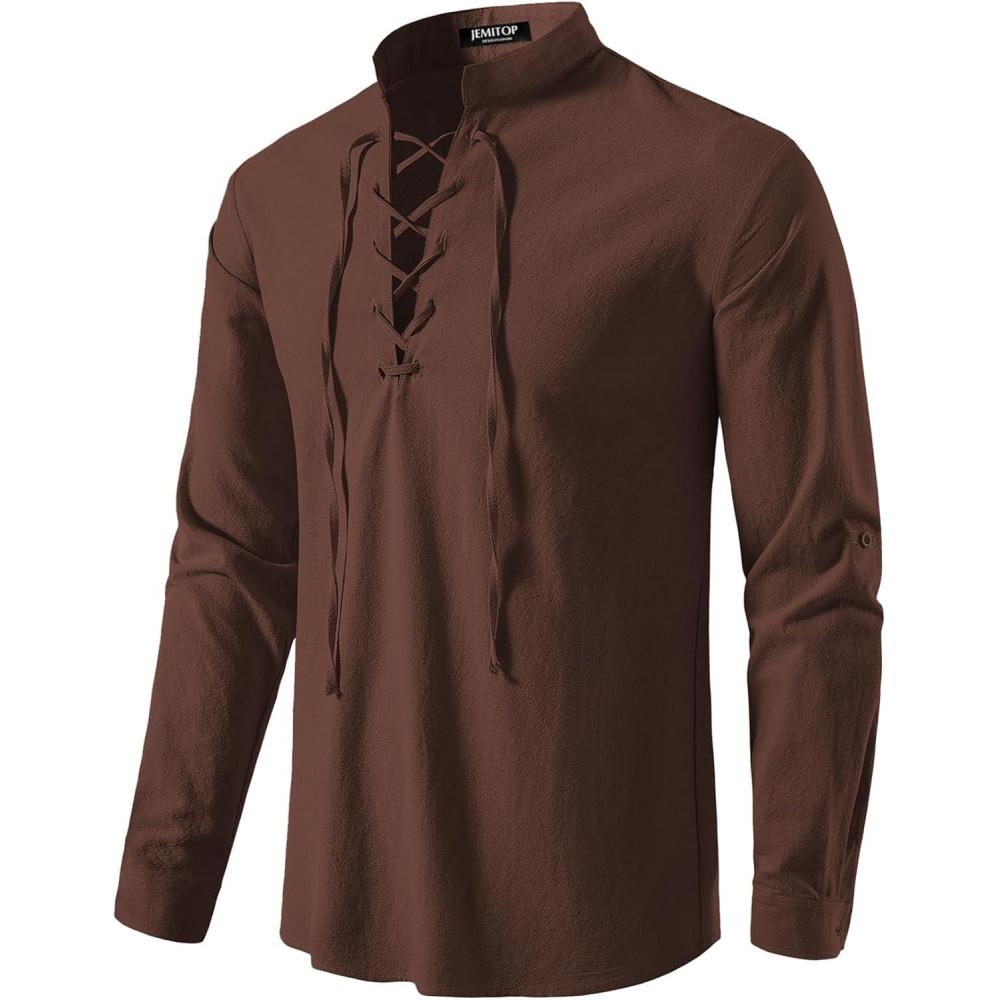 JEMITOP Men’s Pure Cotton Retro Lace Up Shirts for Renaissance Pirate Medieval Viking(Brown)