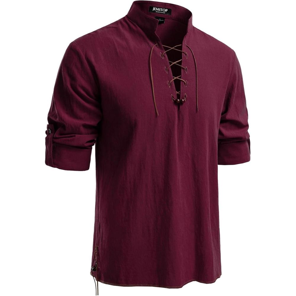 imageJEMITOP Mens Pure Cotton Retro Lace Up Shirts for Renaissance Pirate Medieval VikingBurgundy Retro