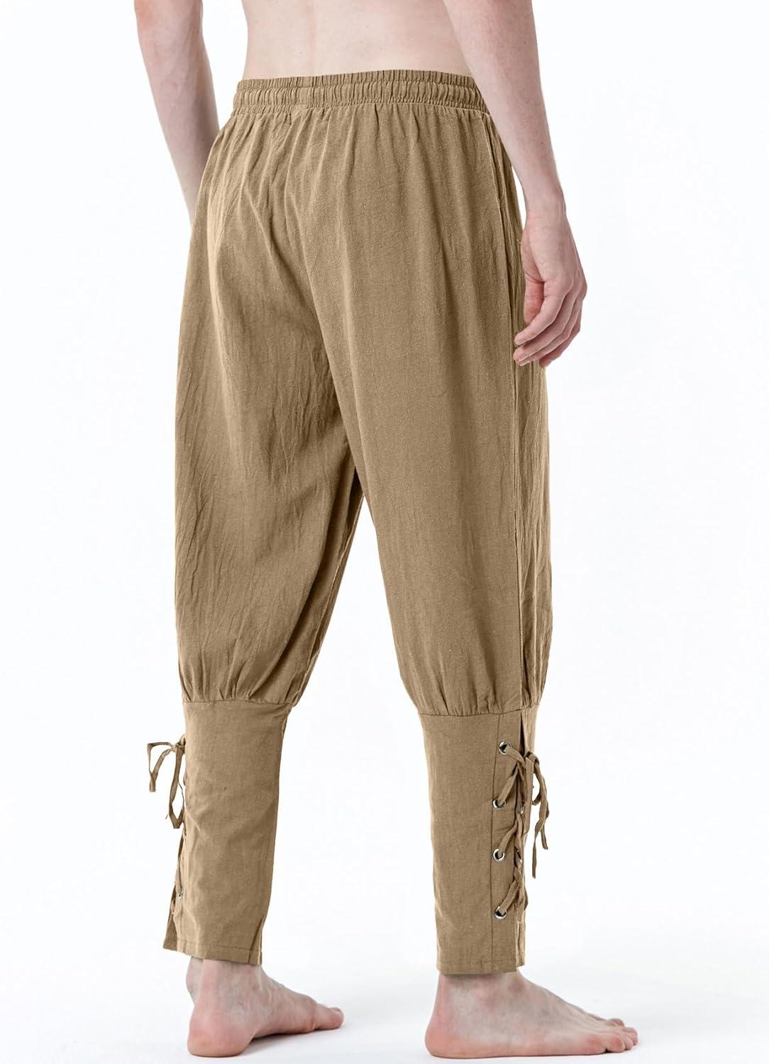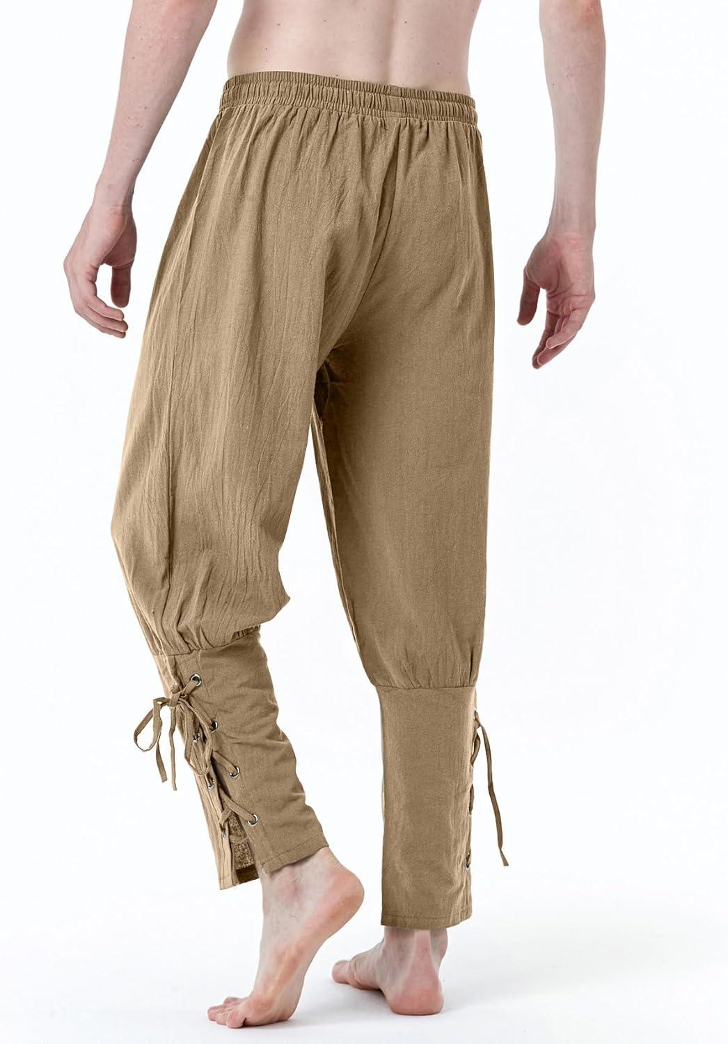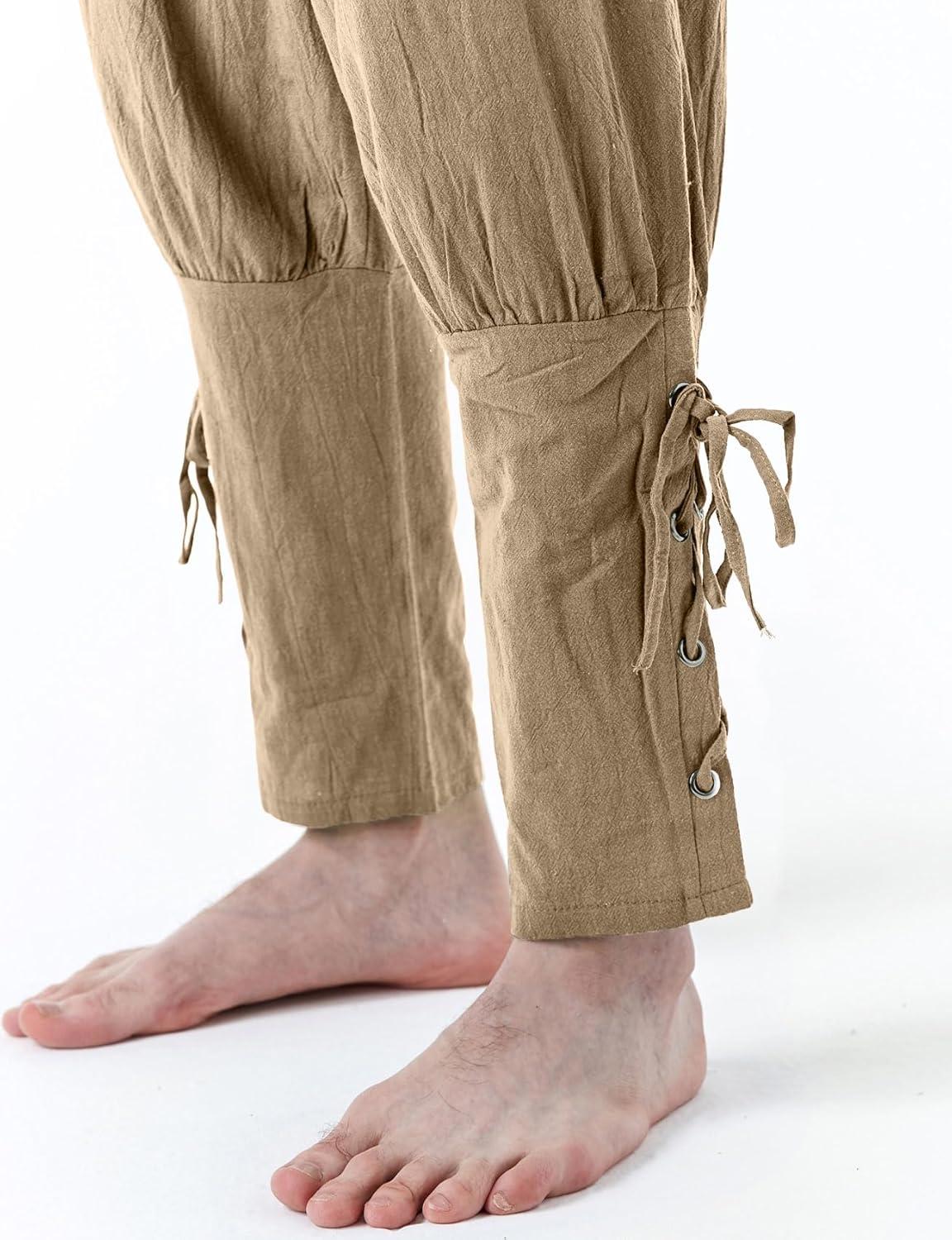 JEMITOP Men's Pure Cotton Vintage Ankle Banded Pants for Renaissance Pirate Viking Medieval Costume(Dark Khaki)