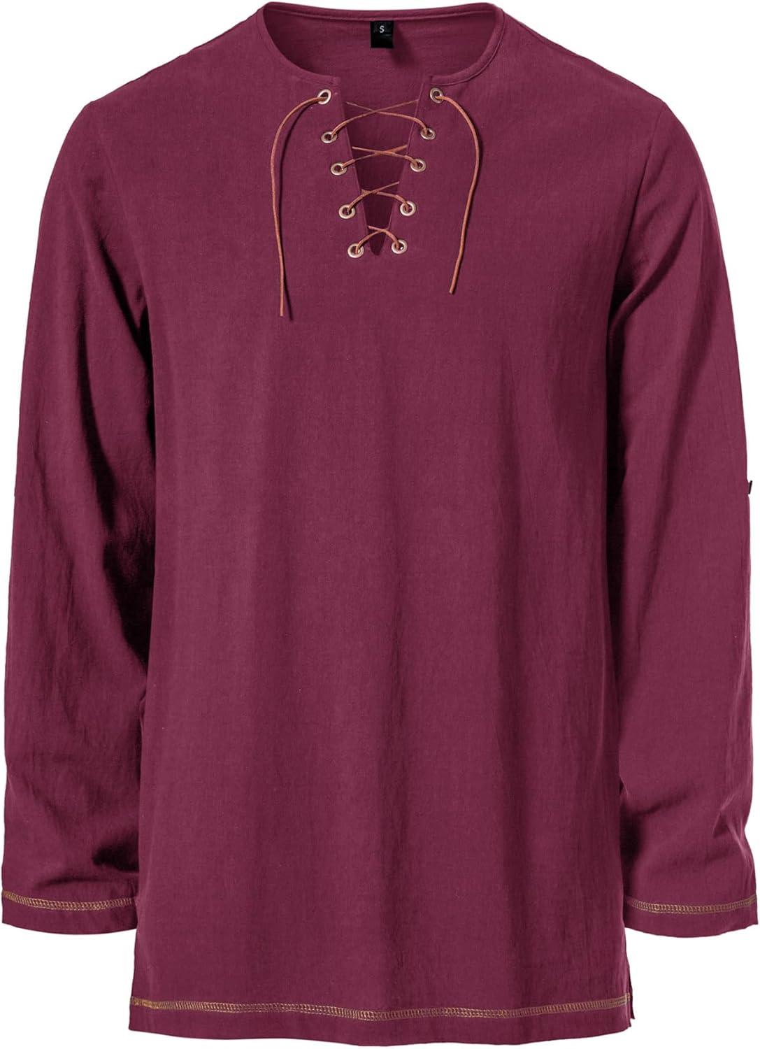 JEMITOP Men’s Pure Cotton Vintage Lace Up Shirts for Pirate Renaissance Viking Medieval Costume Without Belt(Burgundy)