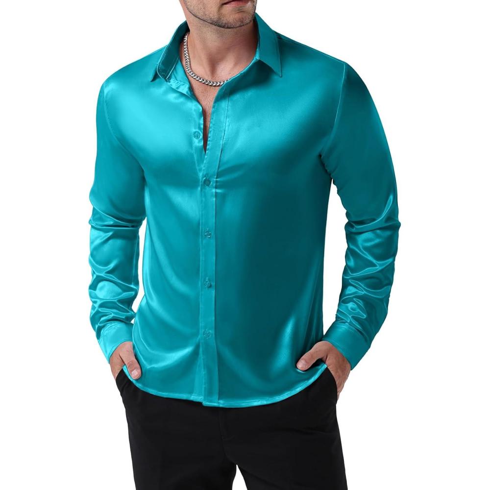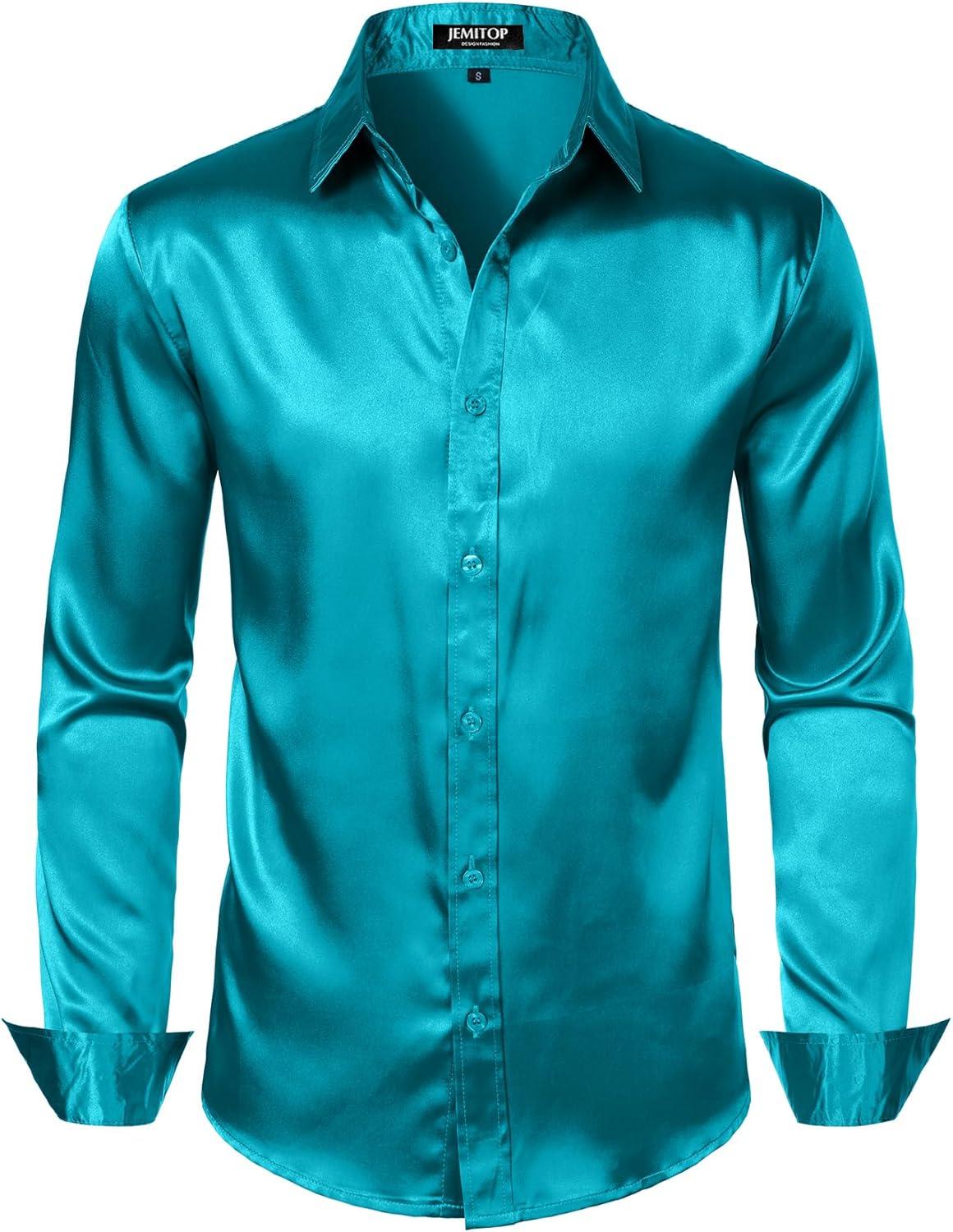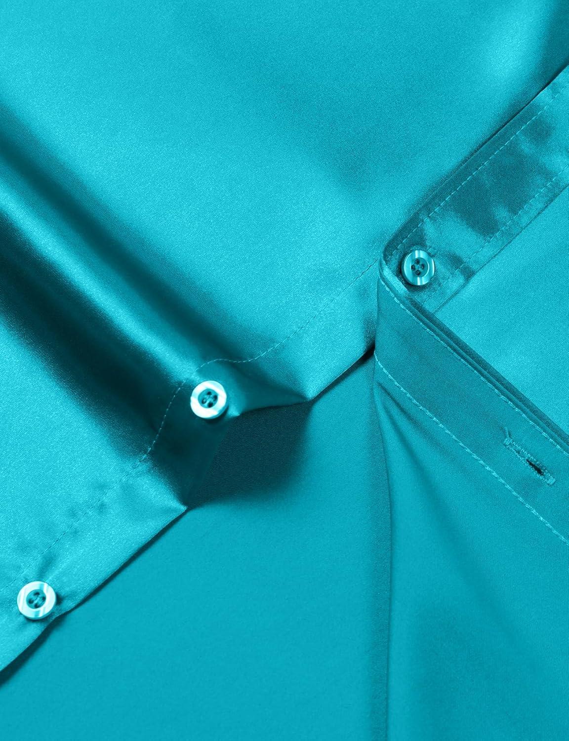 JEMITOP Mens Shiny Luxury Satin Slim Fit Dress Shirts Silk-Like Glossy Long Sleeve Button Down Shirts for Wedding Party Prom(Teal)