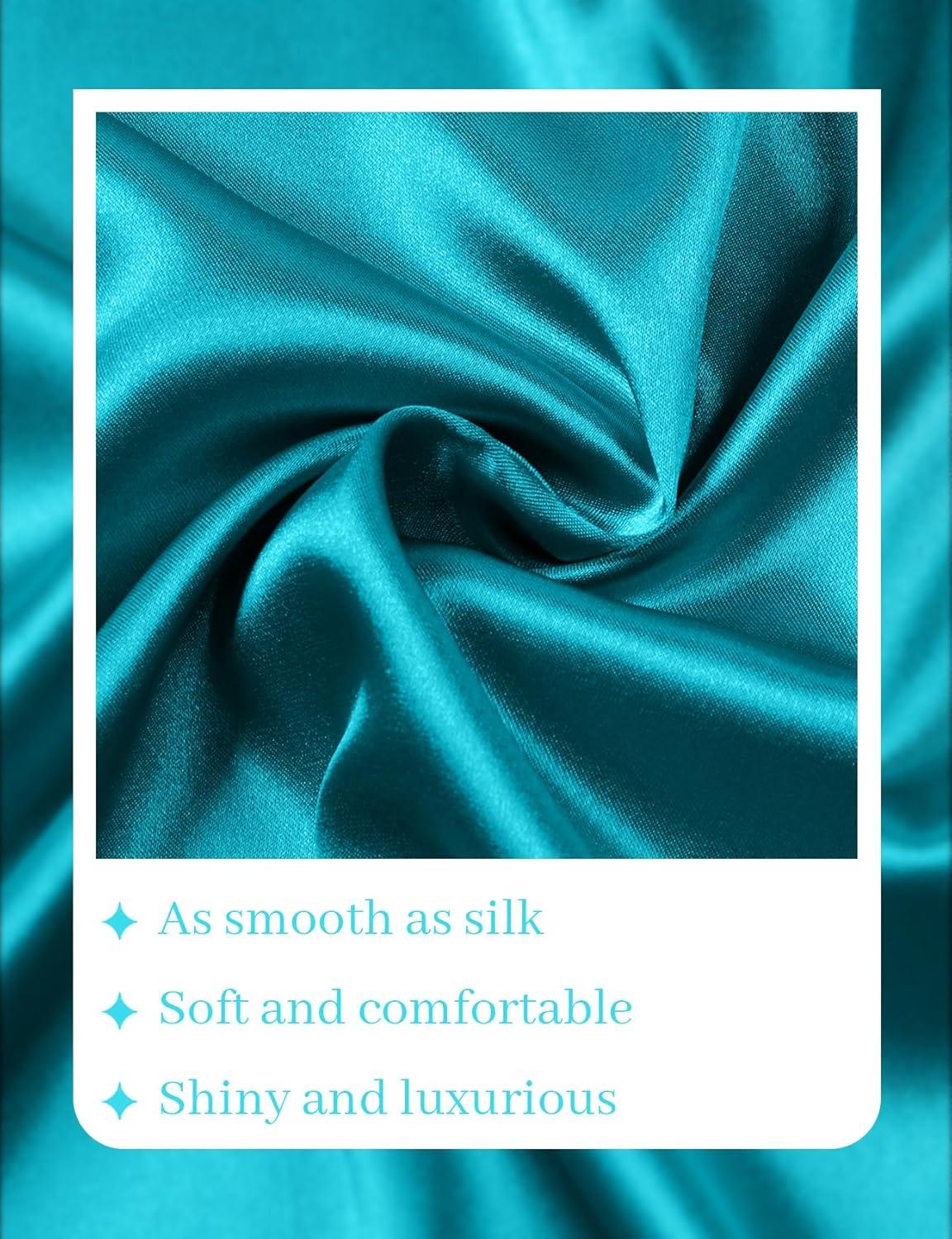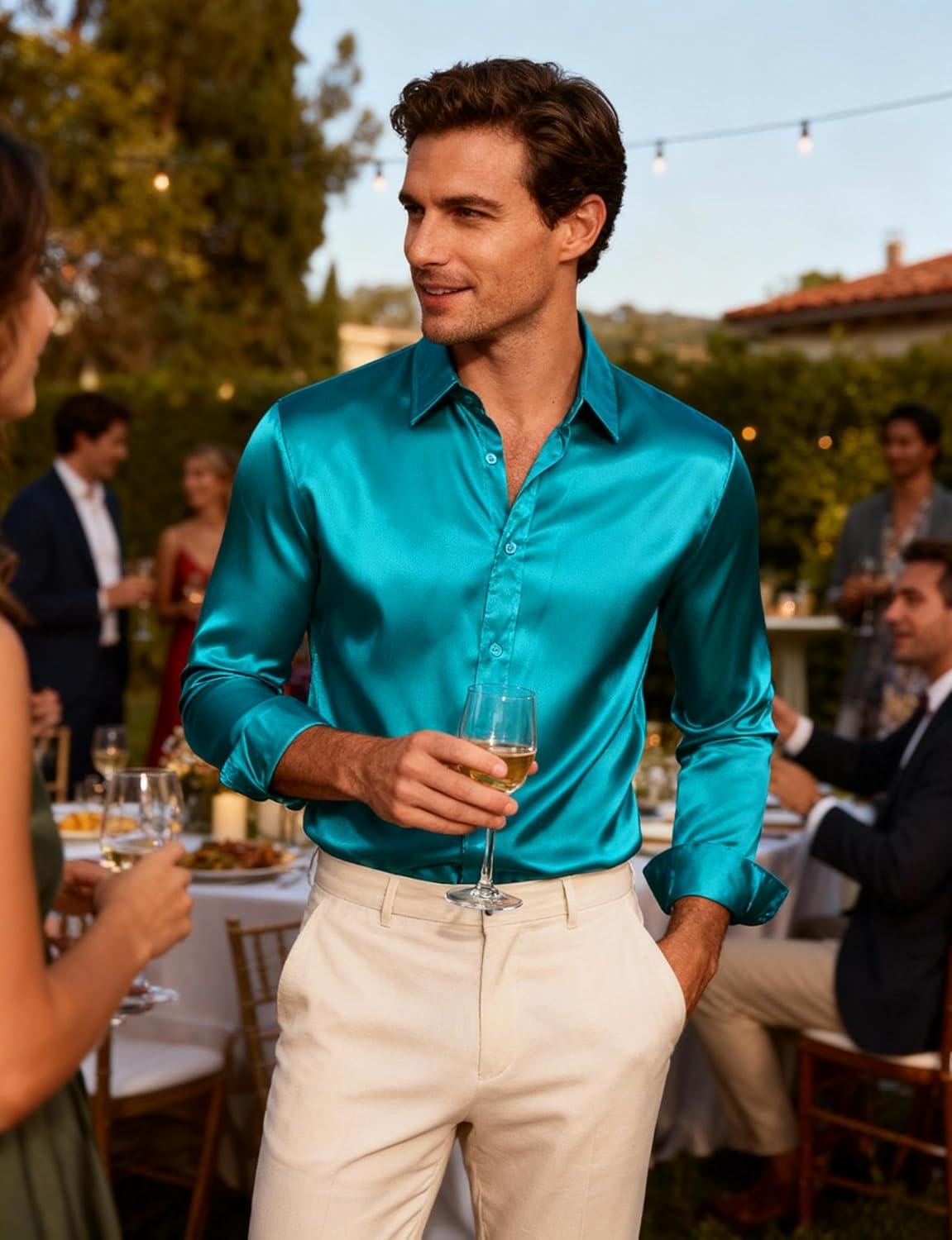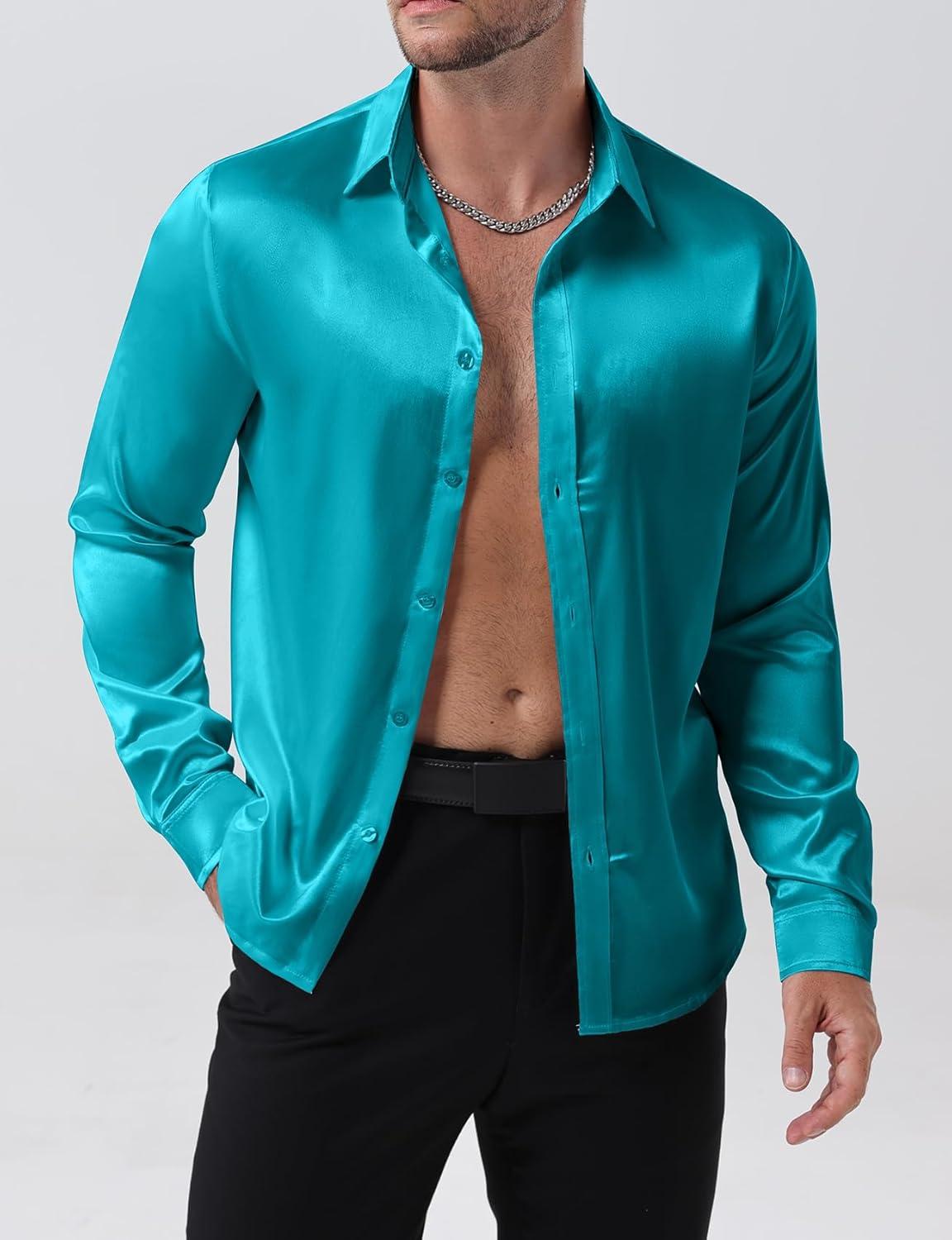JEMITOP Mens Shiny Luxury Satin Slim Fit Dress Shirts Silk-Like Glossy Long Sleeve Button Down Shirts for Wedding Party Prom(Teal)