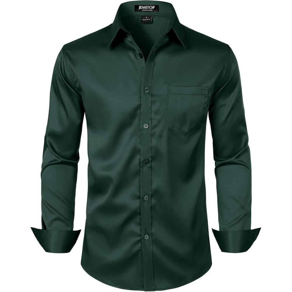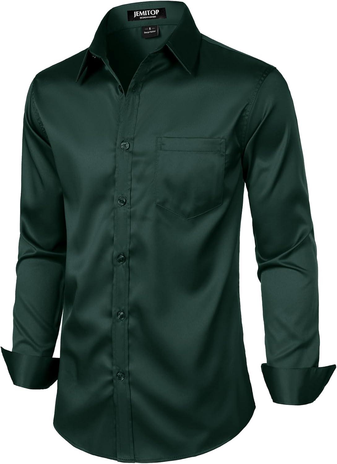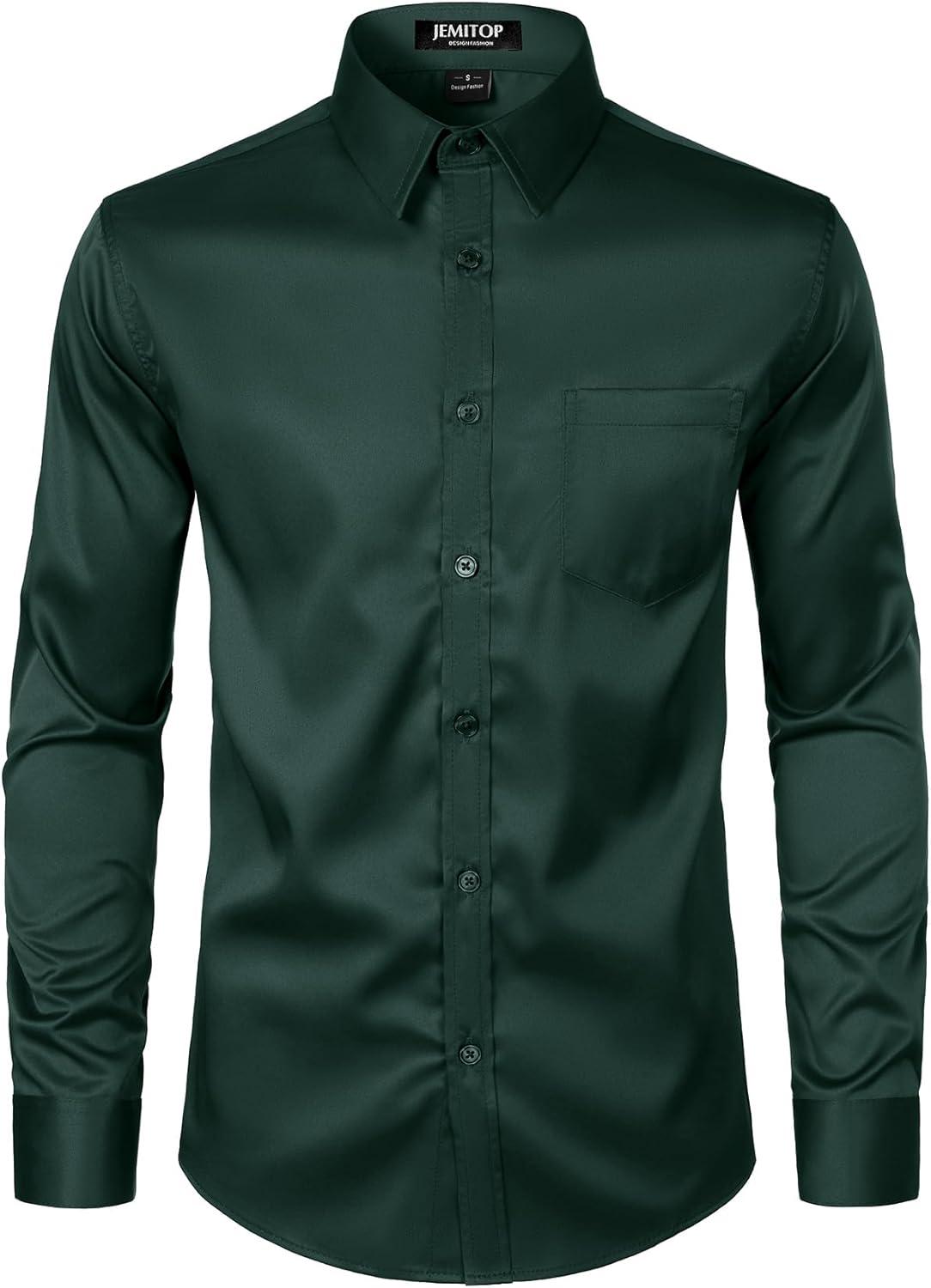 JEMITOP Men's Stretch Slim Fit Dress Shirts Formal Wedding Prom Business Long Sleeve Button Down Shirt with Pocket(Dark Green)