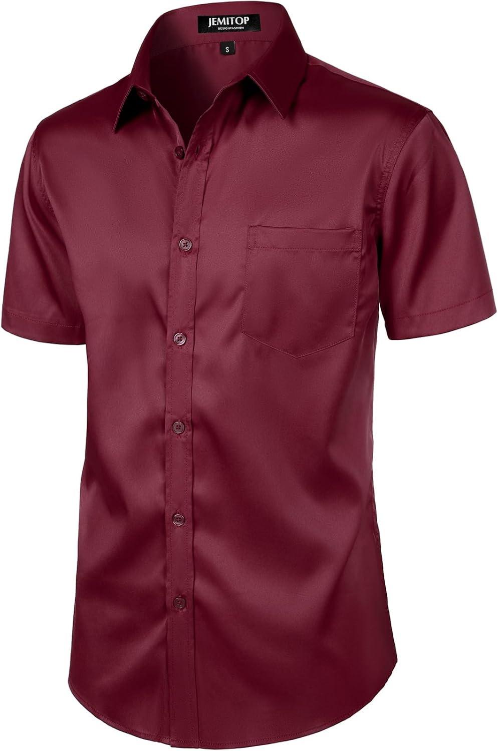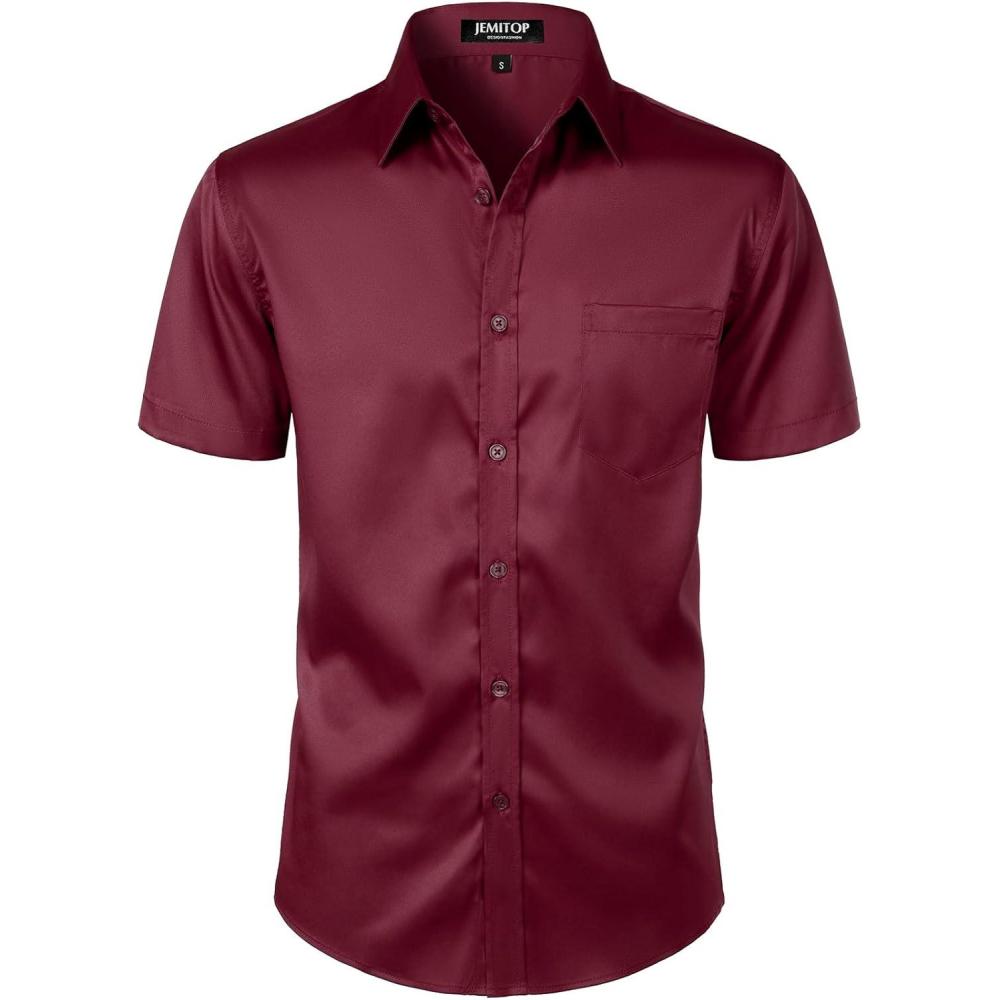 imageJEMITOP Mens Stretch Slim Fit Dress Shirts Formal Wedding Prom Short Sleeve Button Down Shirt with PocketBurgundy