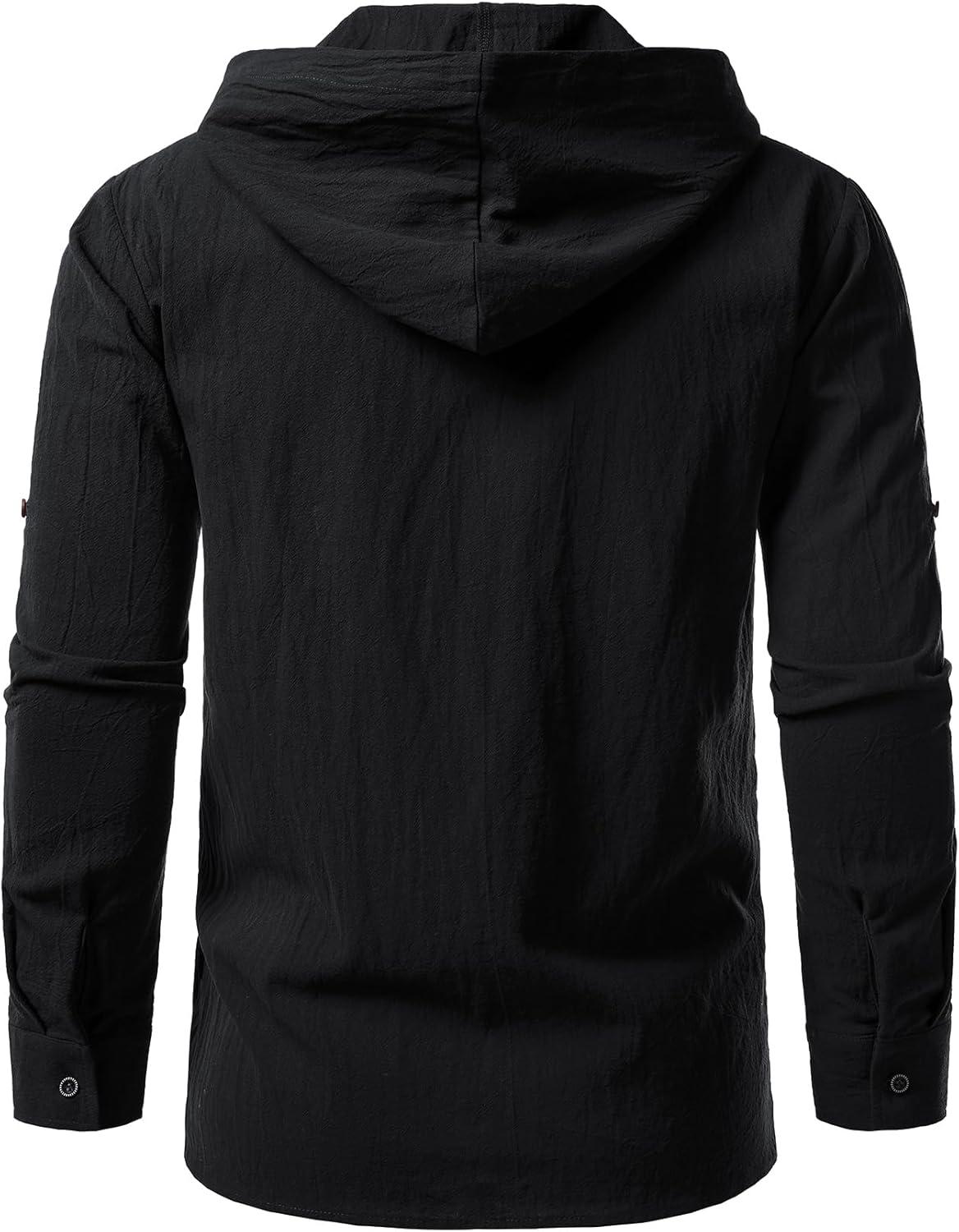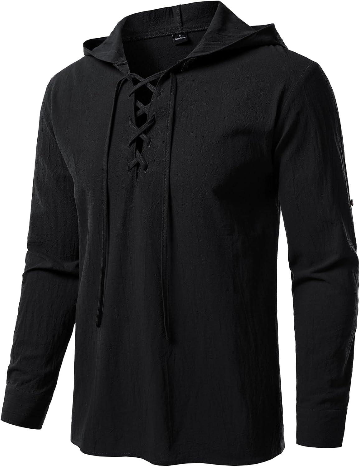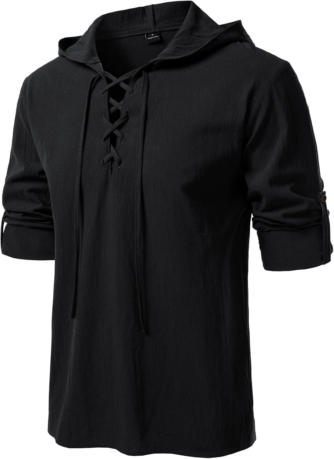 Men's Pure Cotton Retro Style Lace Up Hooded Shirts for Renaissance Pirate Viking Medieval Costume(Black)