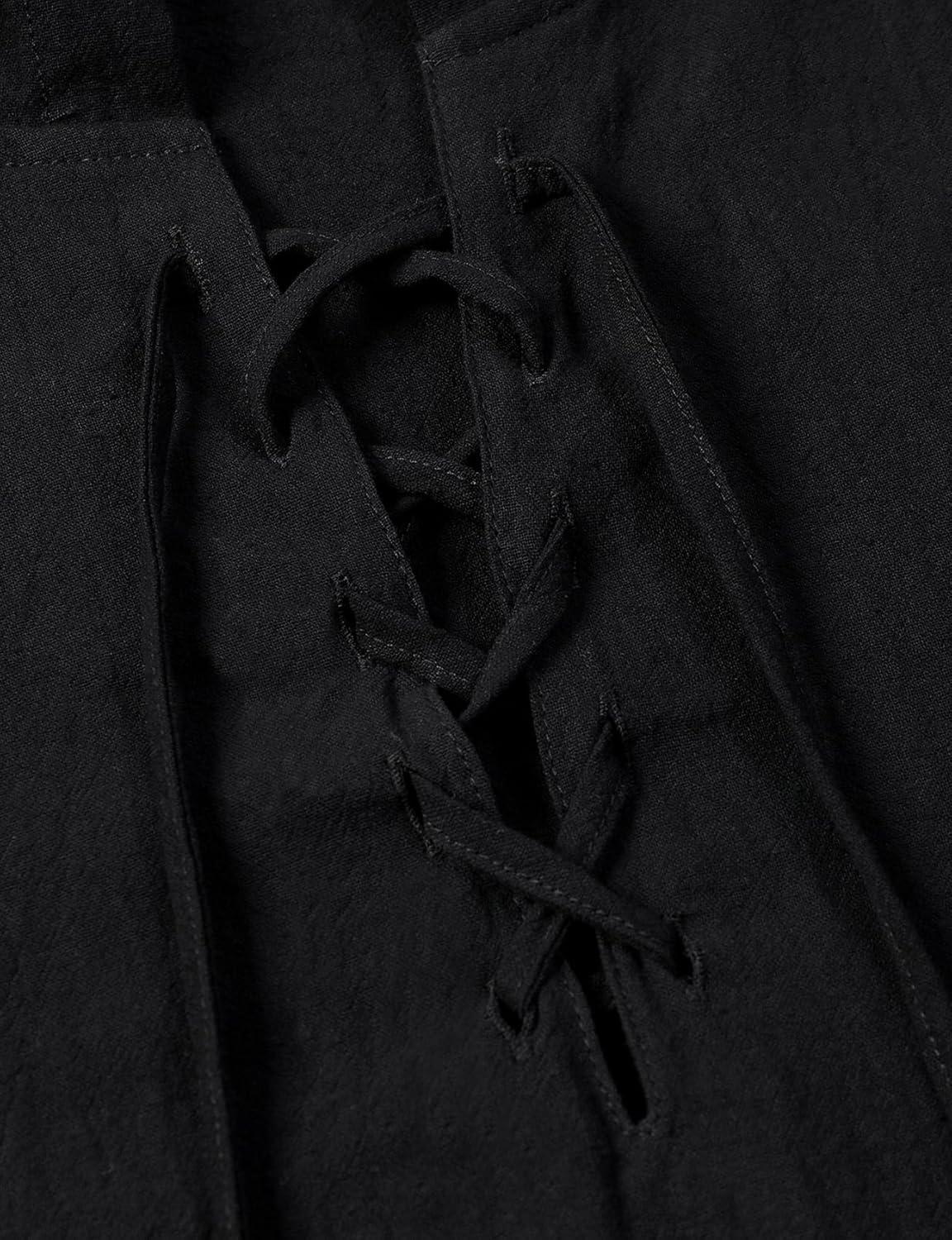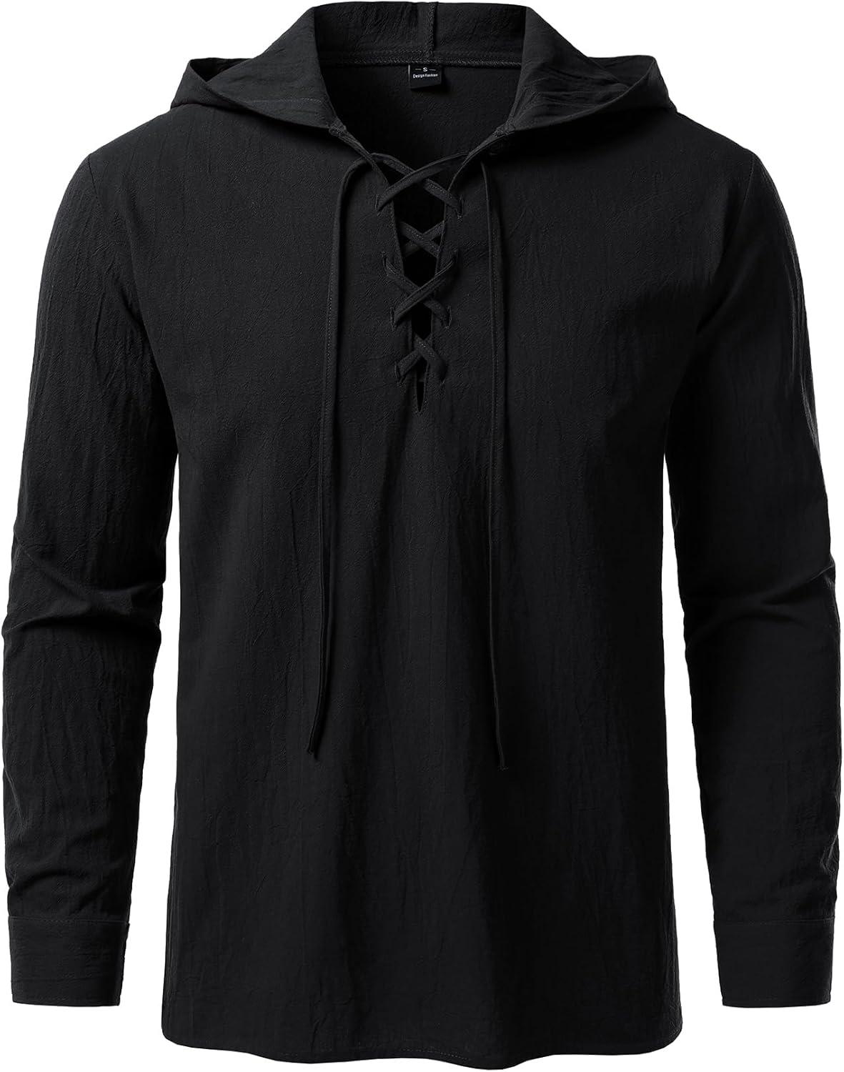 Men’s Pure Cotton Retro Style Lace Up Hooded Shirts for Renaissance Pirate Viking Medieval Costume(Black)