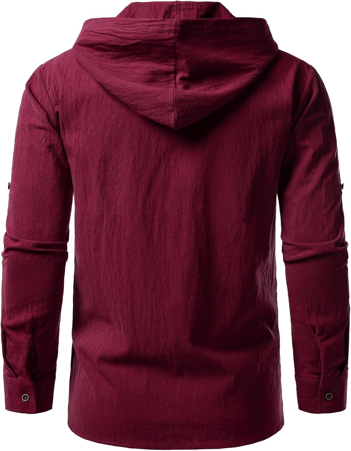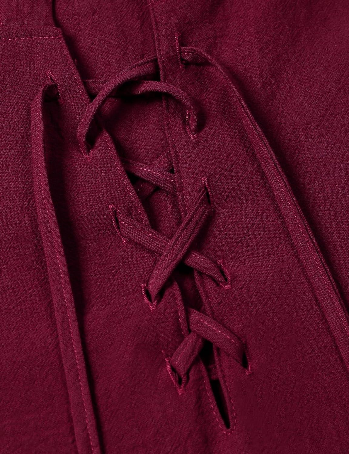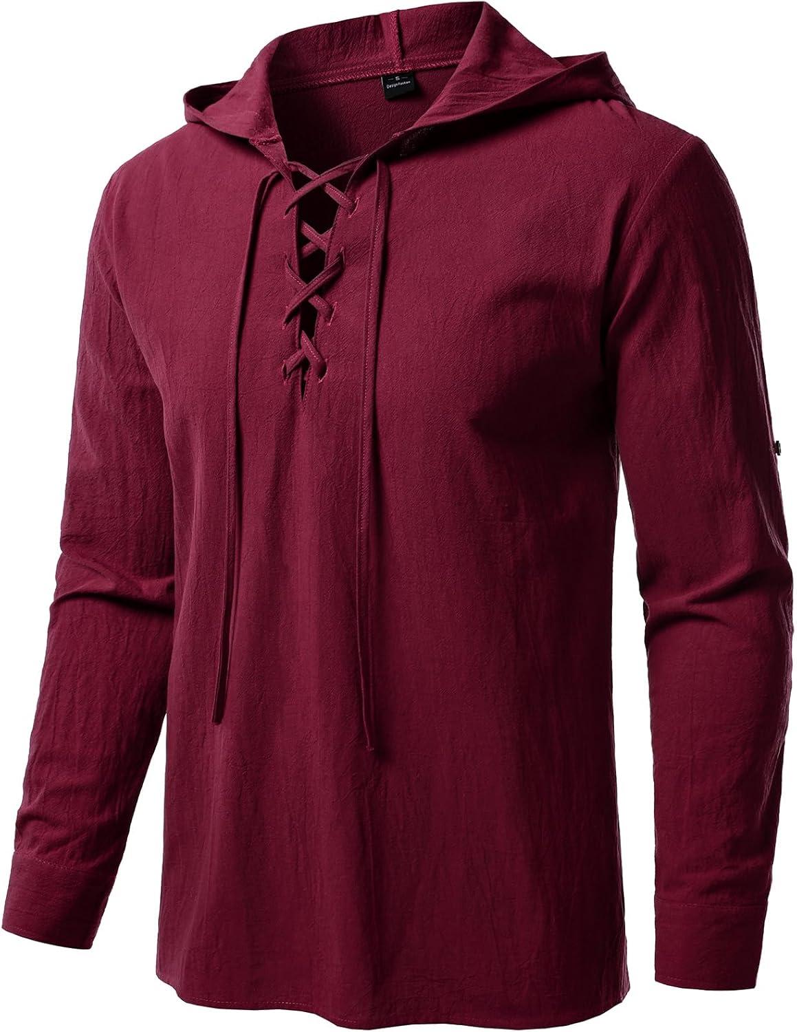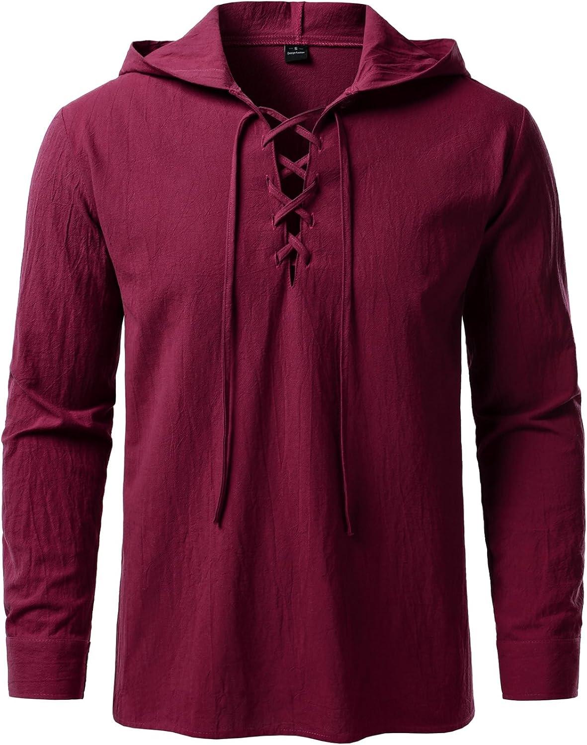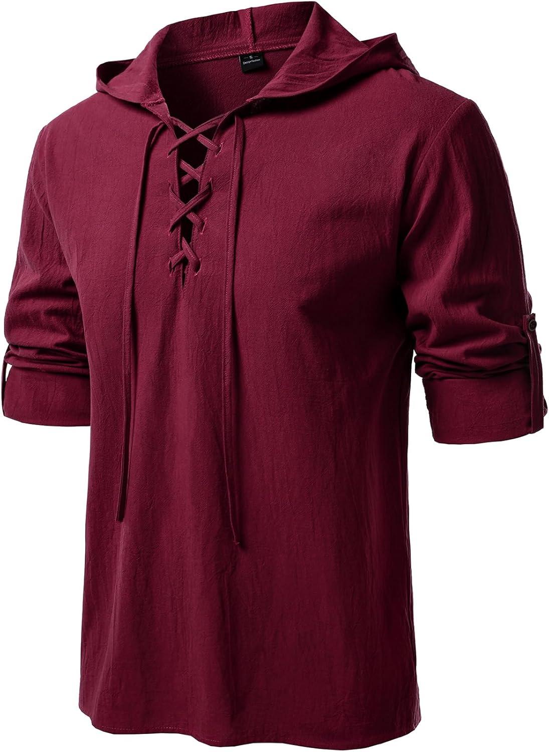 Men’s Pure Cotton Retro Style Lace Up Hooded Shirts for Renaissance Pirate Viking Medieval Costume(Burgundy)