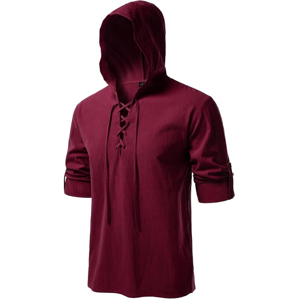 Men's Pure Cotton Retro Style Lace Up Hooded Shirts for Renaissance Pirate Viking Medieval Costume(Burgundy)