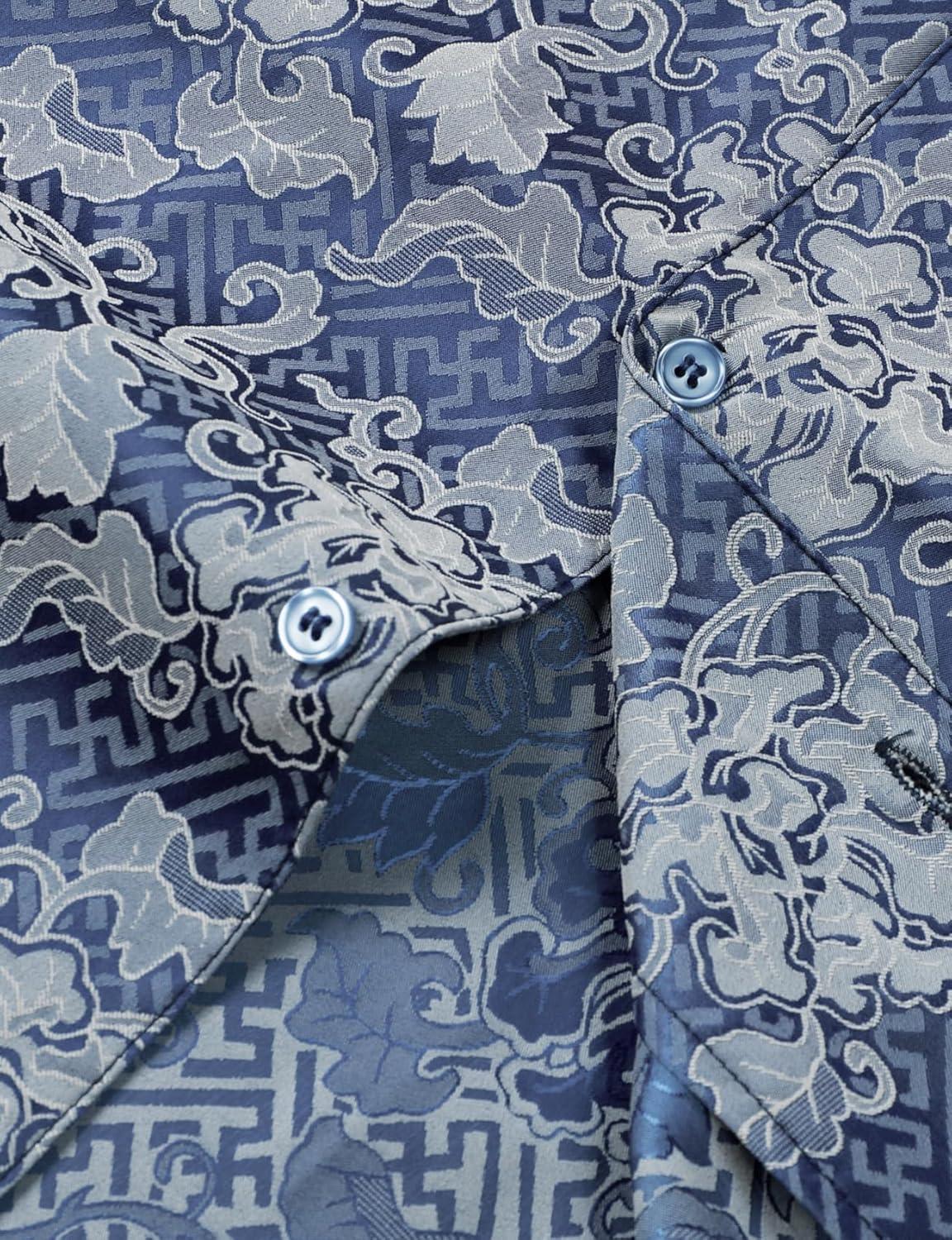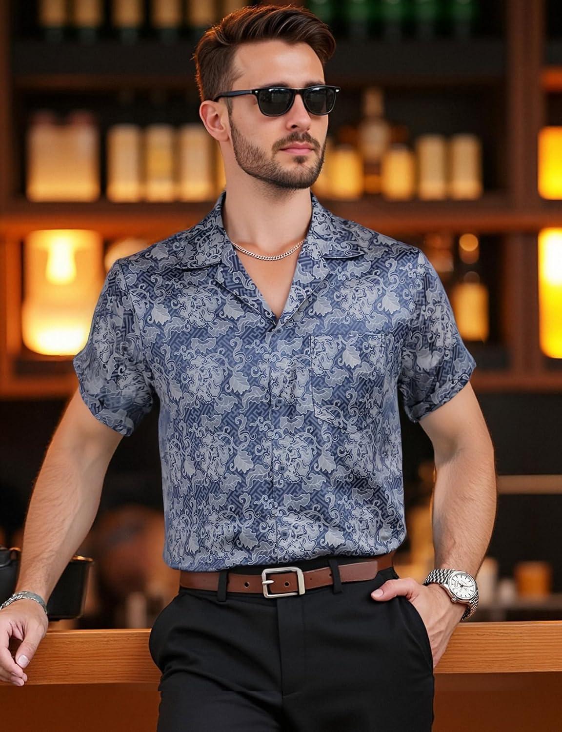 Mens Shiny Satin Silk-Like Designer Shirt Summer Regular Fit Short Sleeve Button Up Floral Shirt with Pocket(Blue)