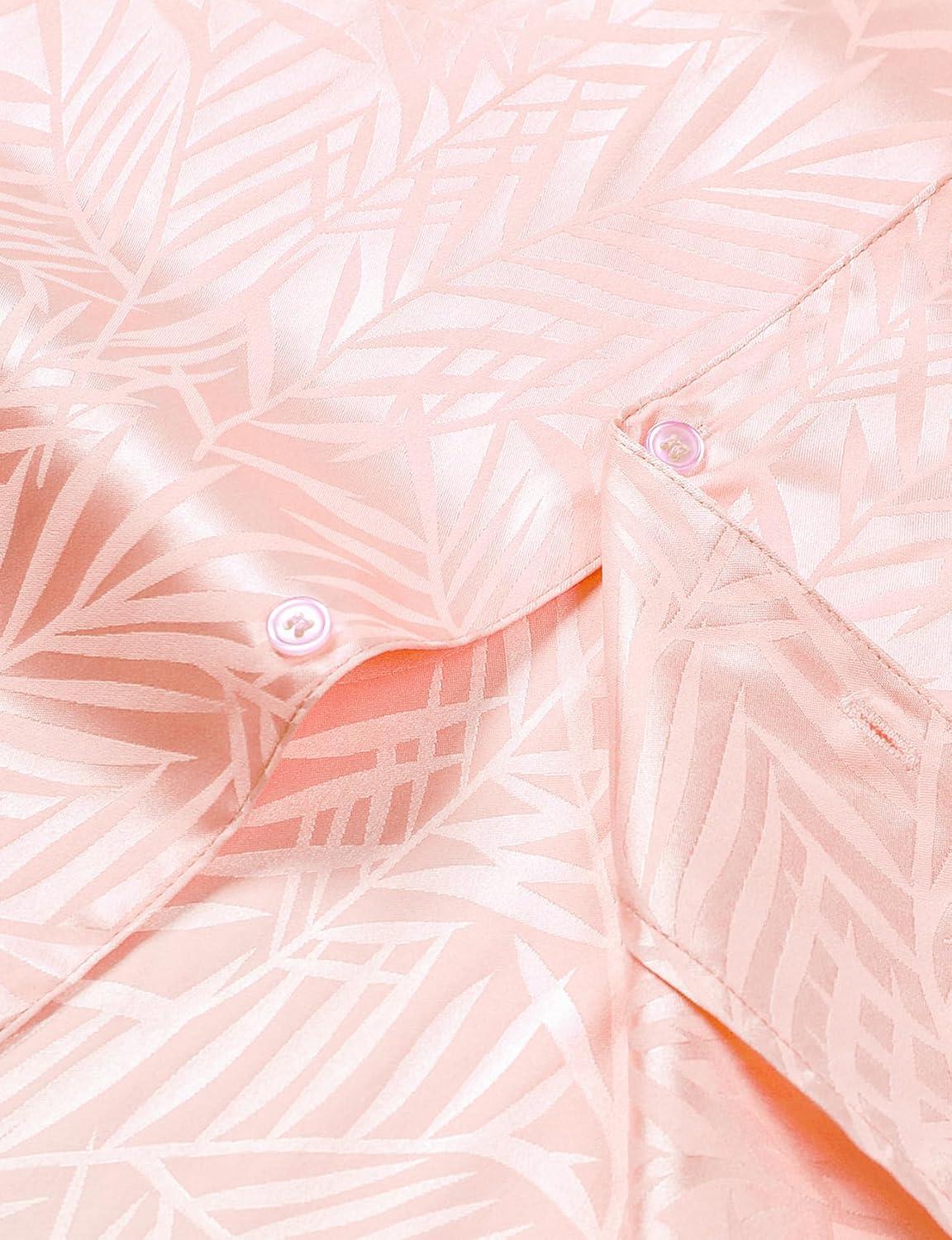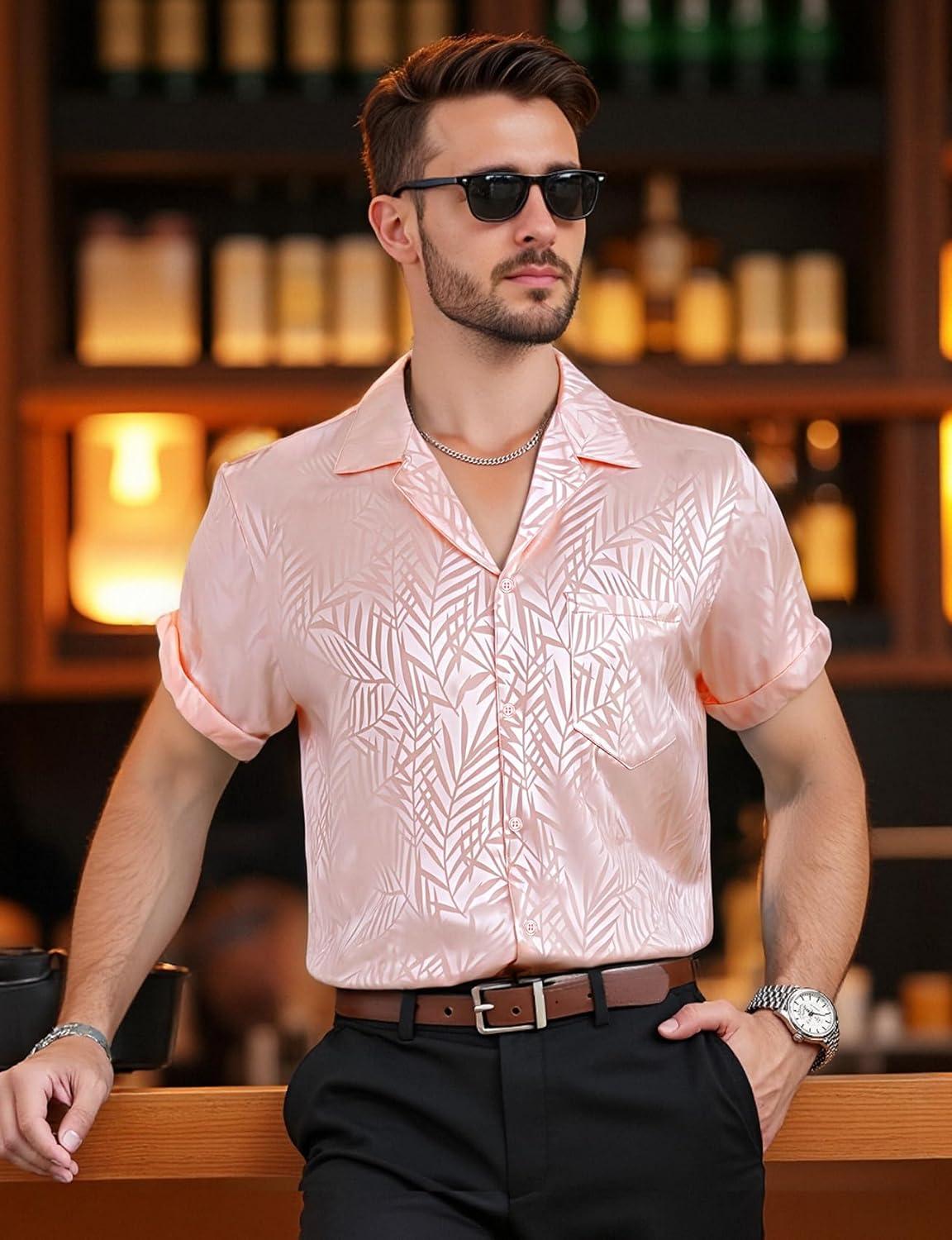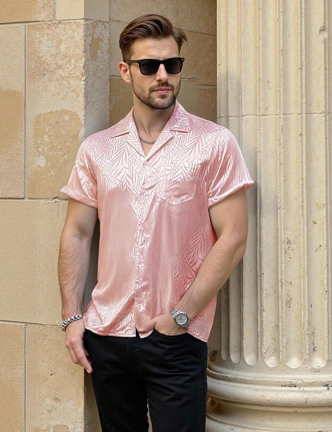 Mens Shiny Satin Silk-Like Designer Shirt Summer Regular Fit Short Sleeve Button Up Floral Shirt with Pocket(Pink)