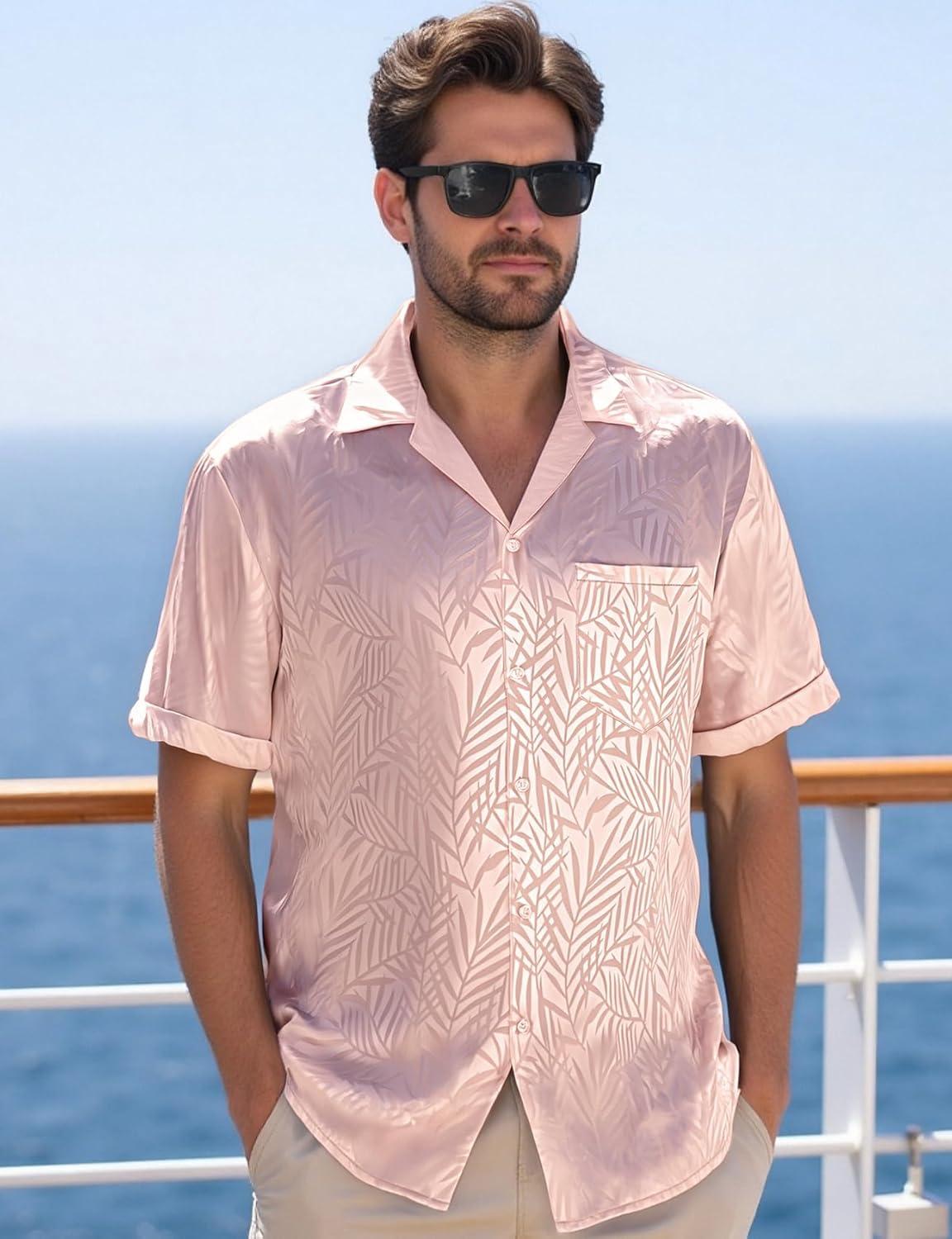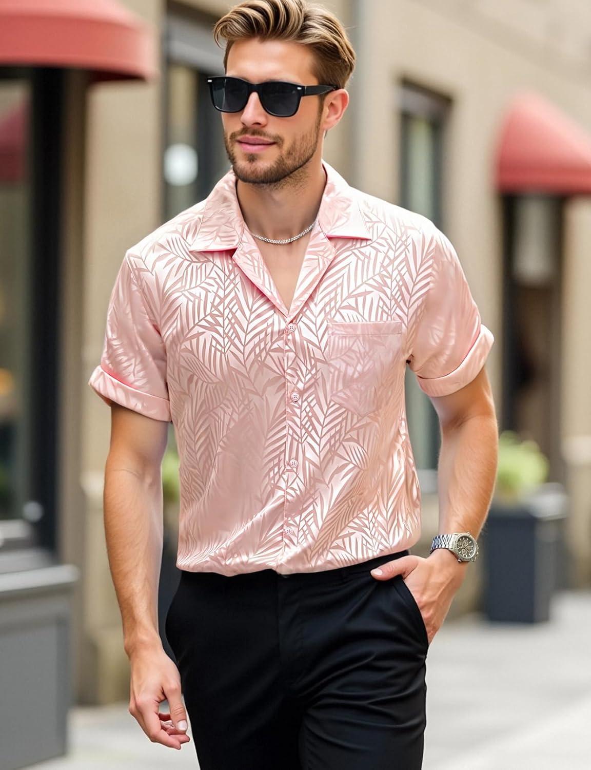 Be the first to review “Mens Shiny Satin Silk-Like Designer Shirt Summer Regular Fit Short Sleeve Button Up Floral Shirt with Pocket(Pink)”