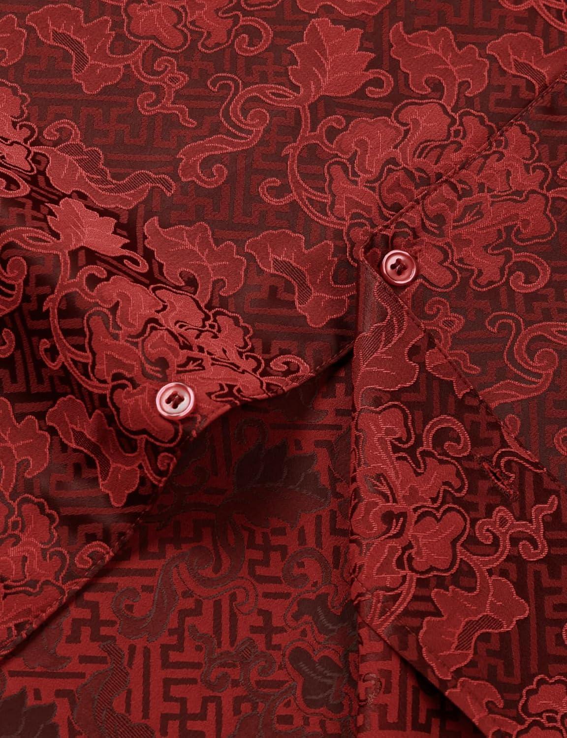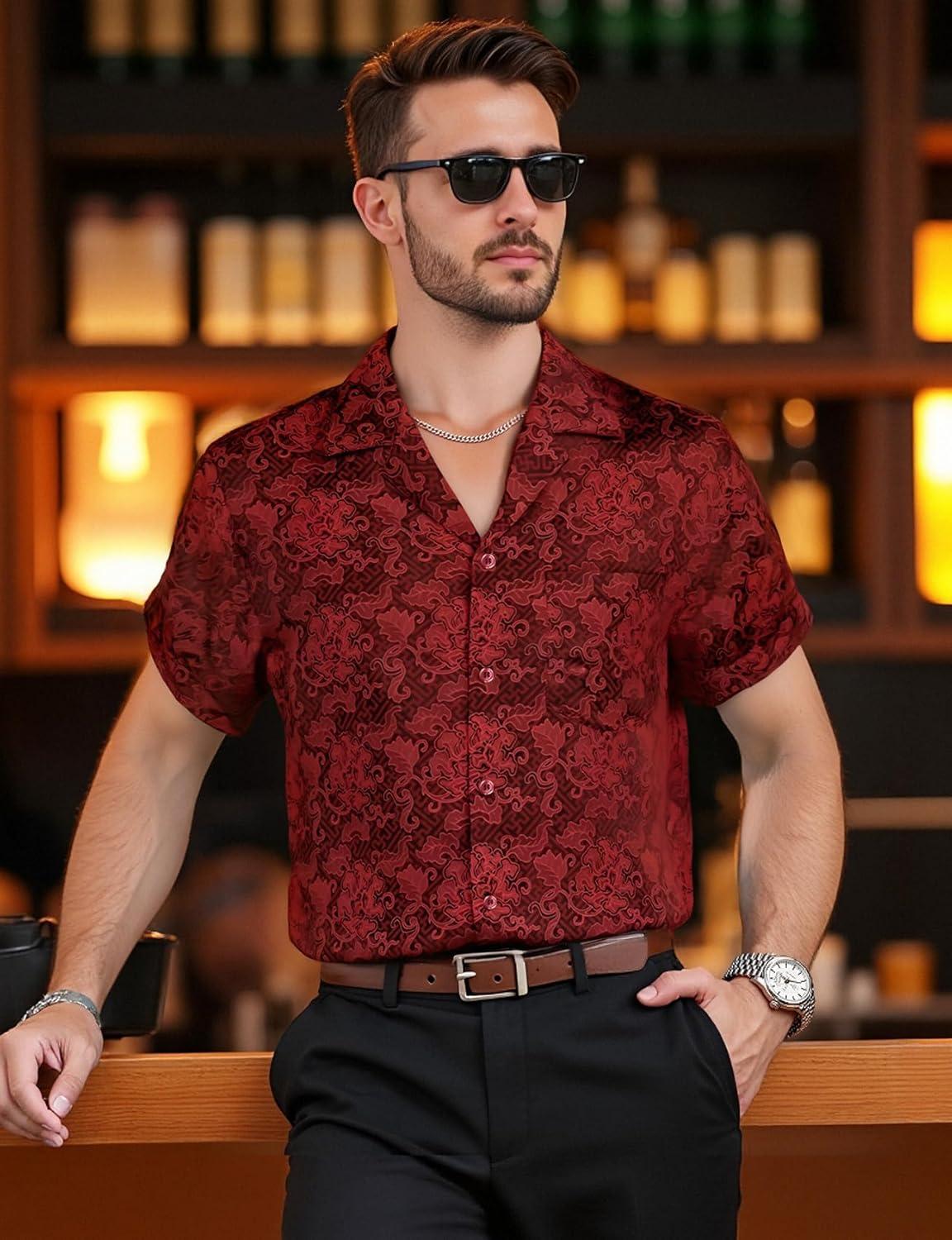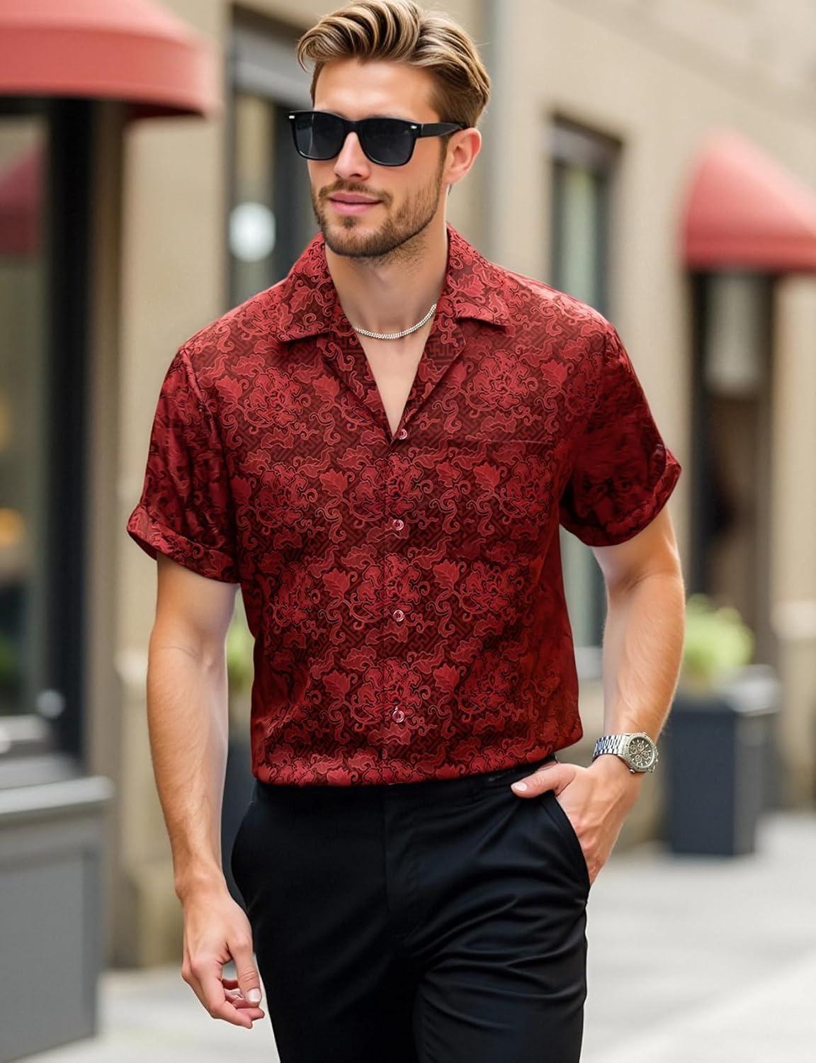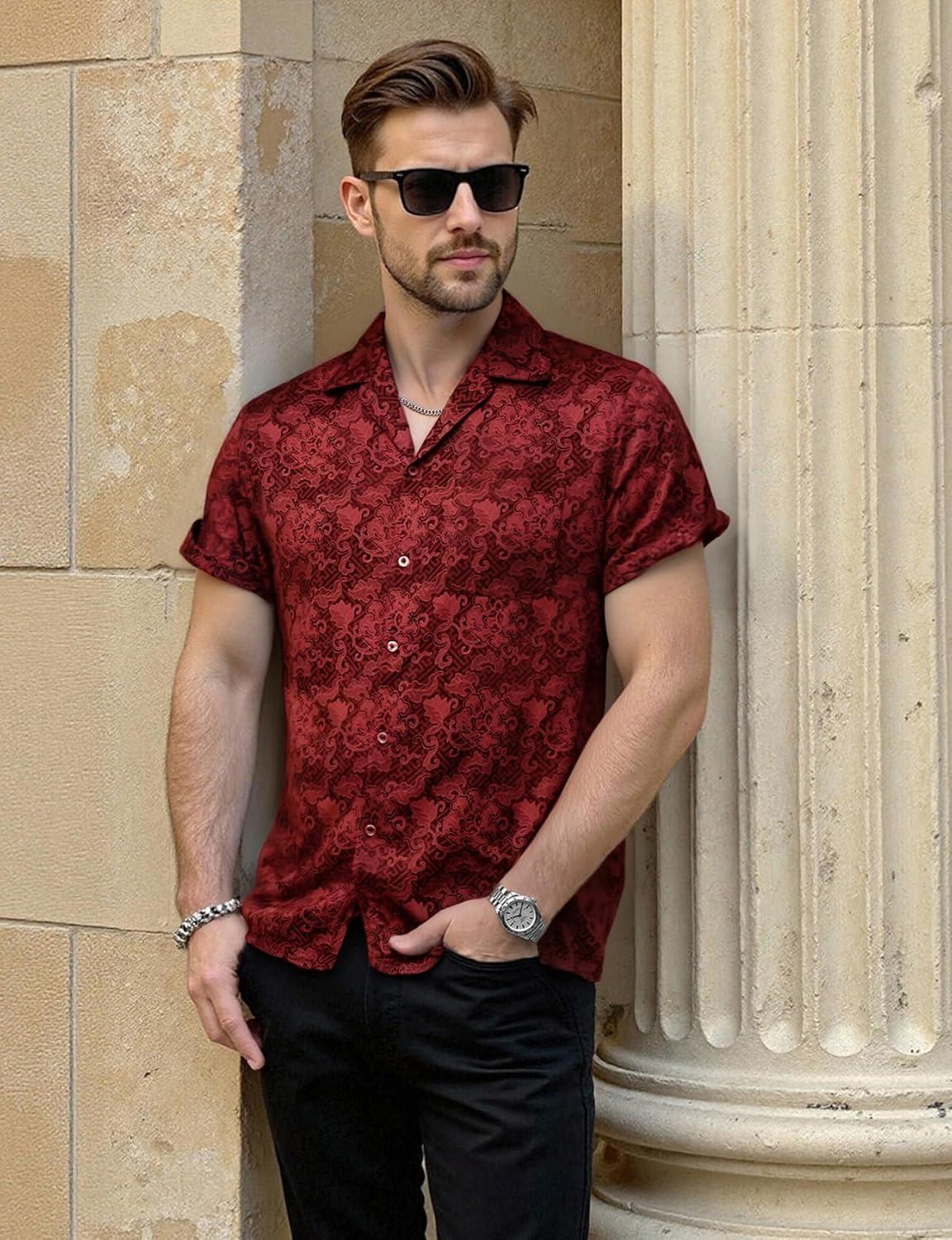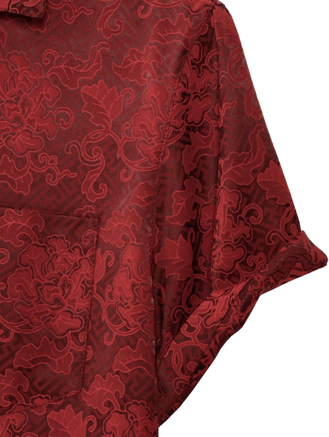 Mens Shiny Satin Silk-Like Designer Shirt Summer Regular Fit Short Sleeve Button Up Floral Shirt with Pocket(Red)