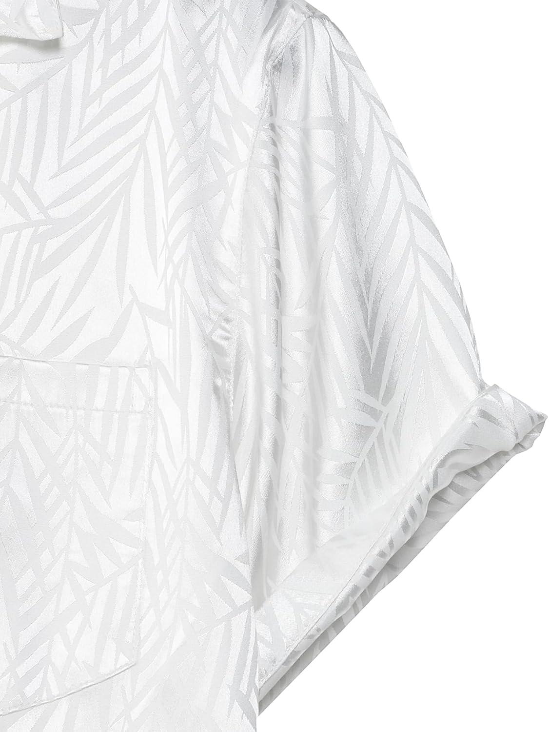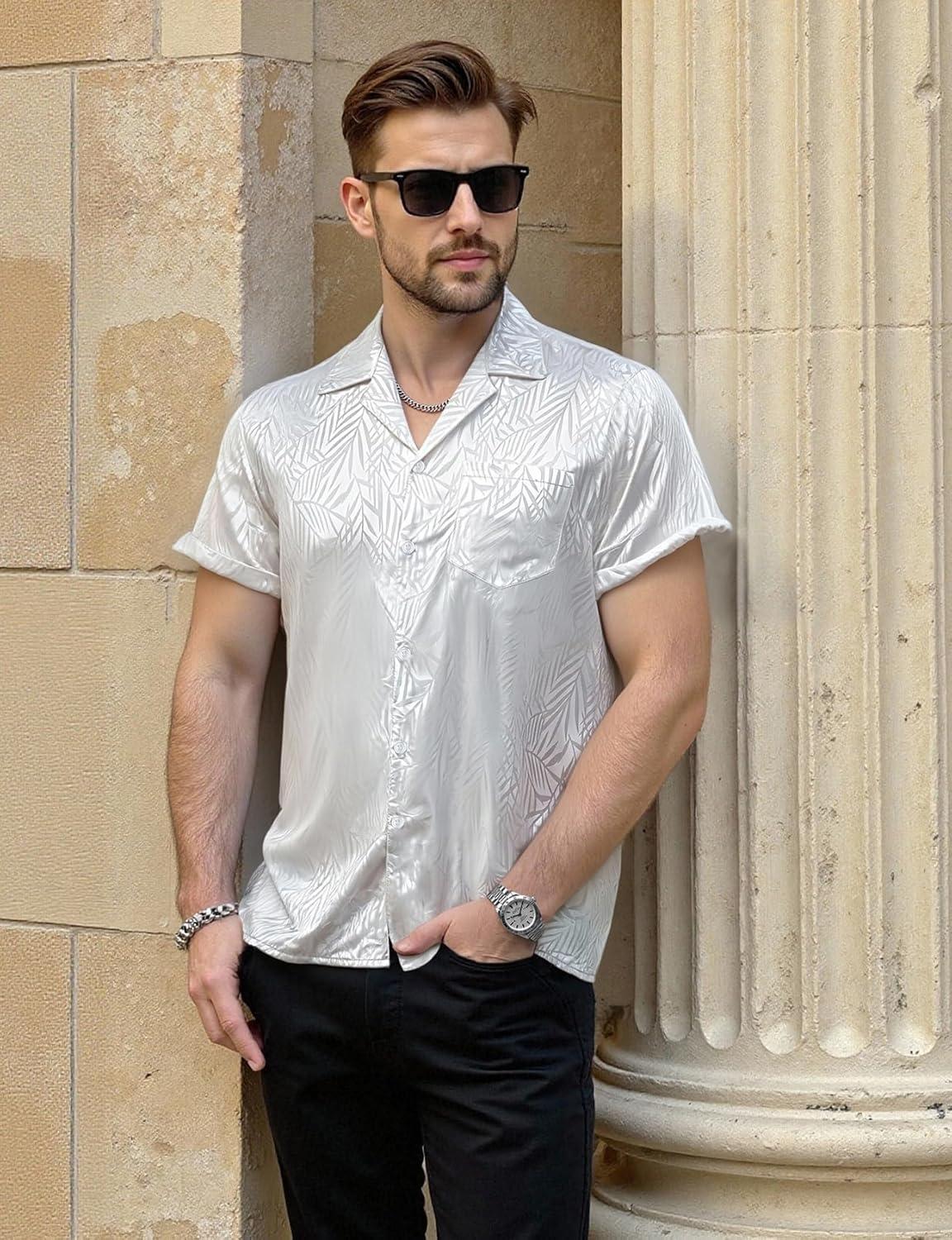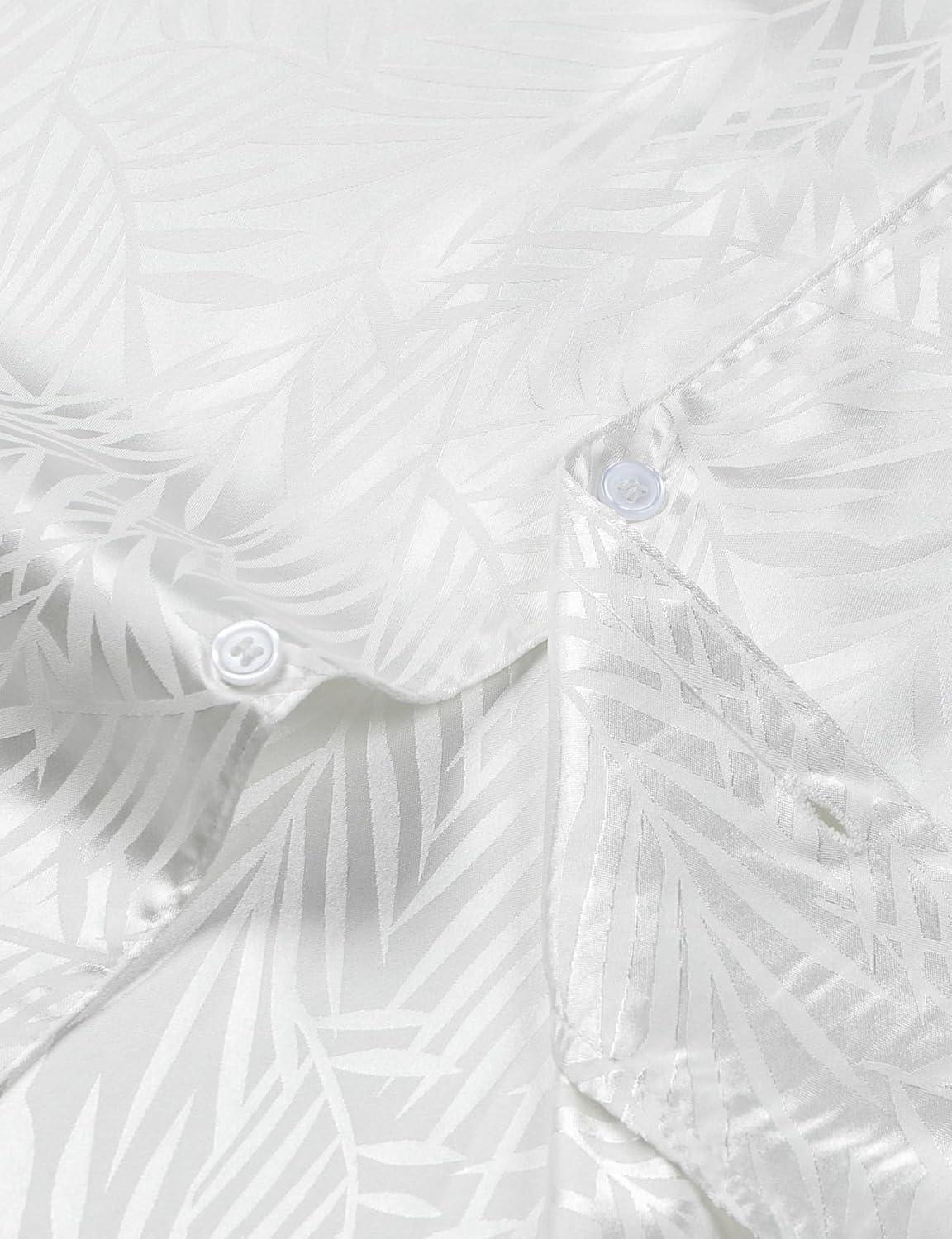 Mens Shiny Satin Silk-Like Designer Shirt Summer Regular Fit Short Sleeve Button Up Floral Shirt with Pocket(White)