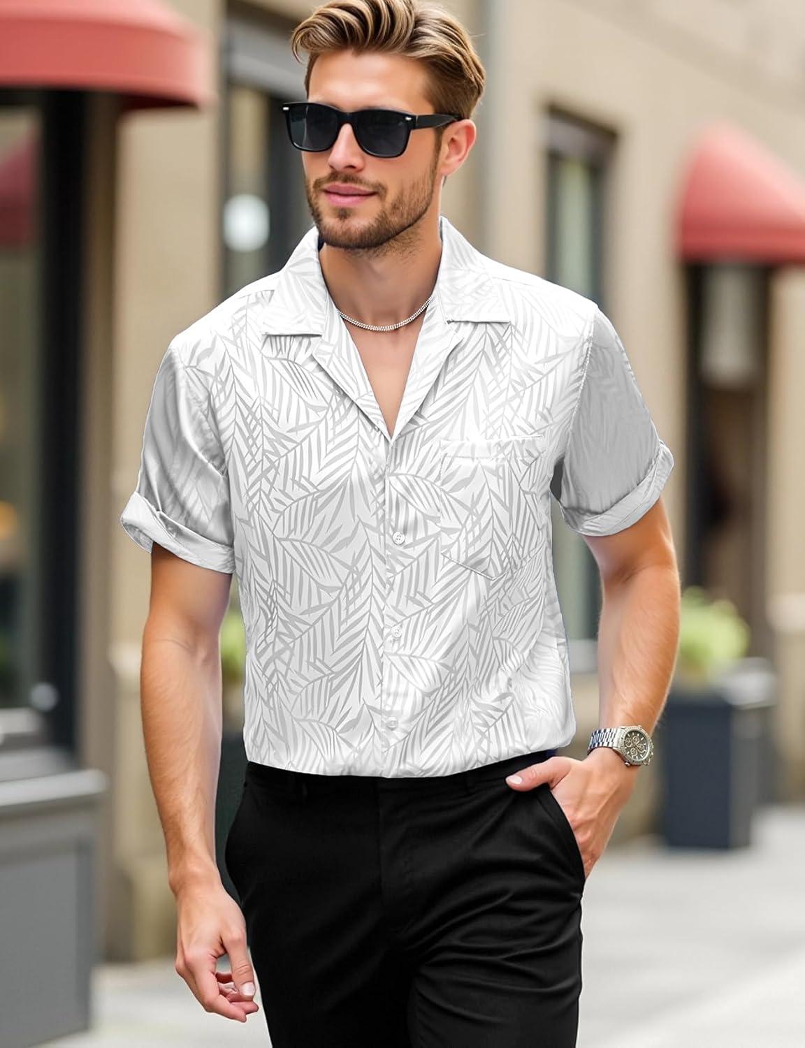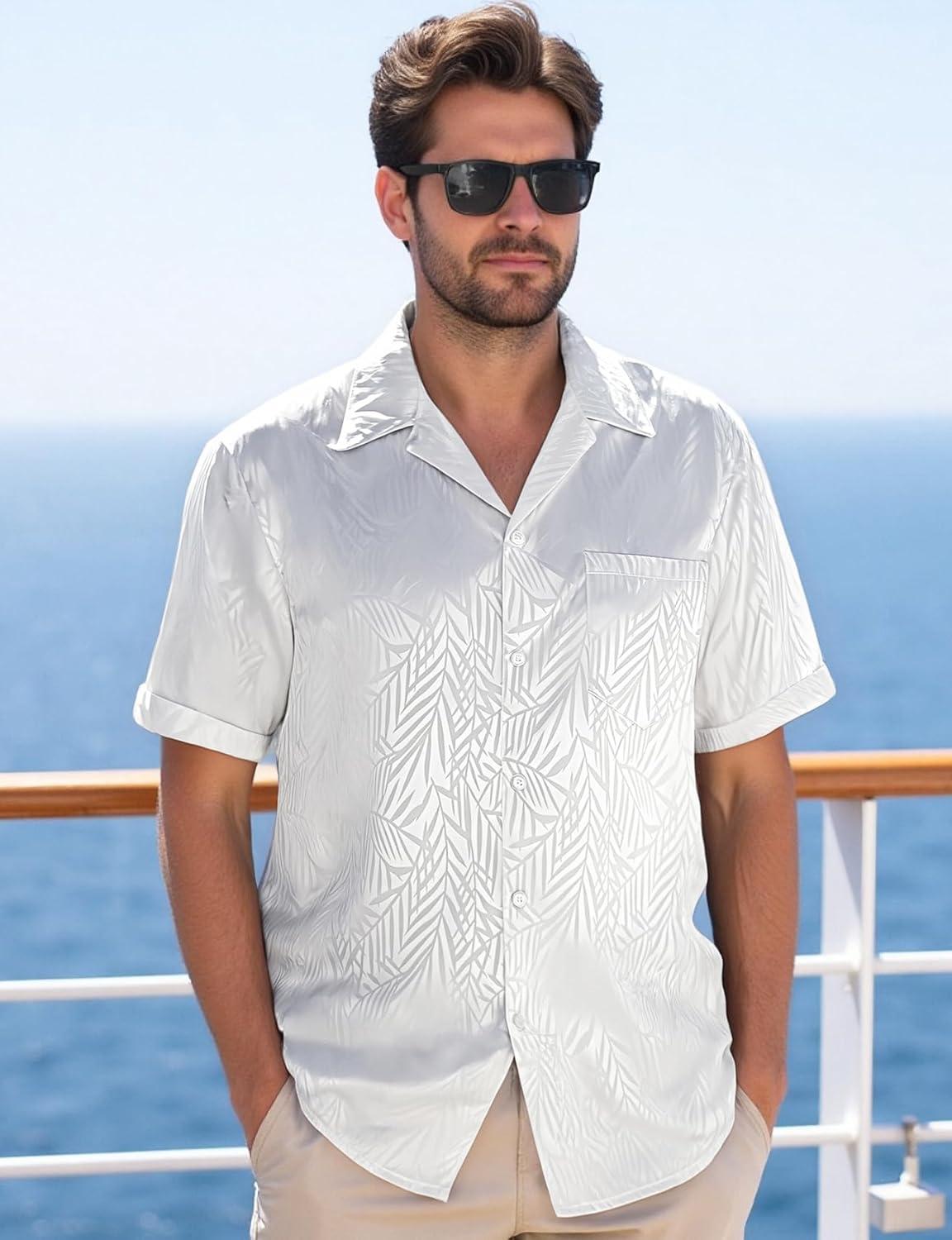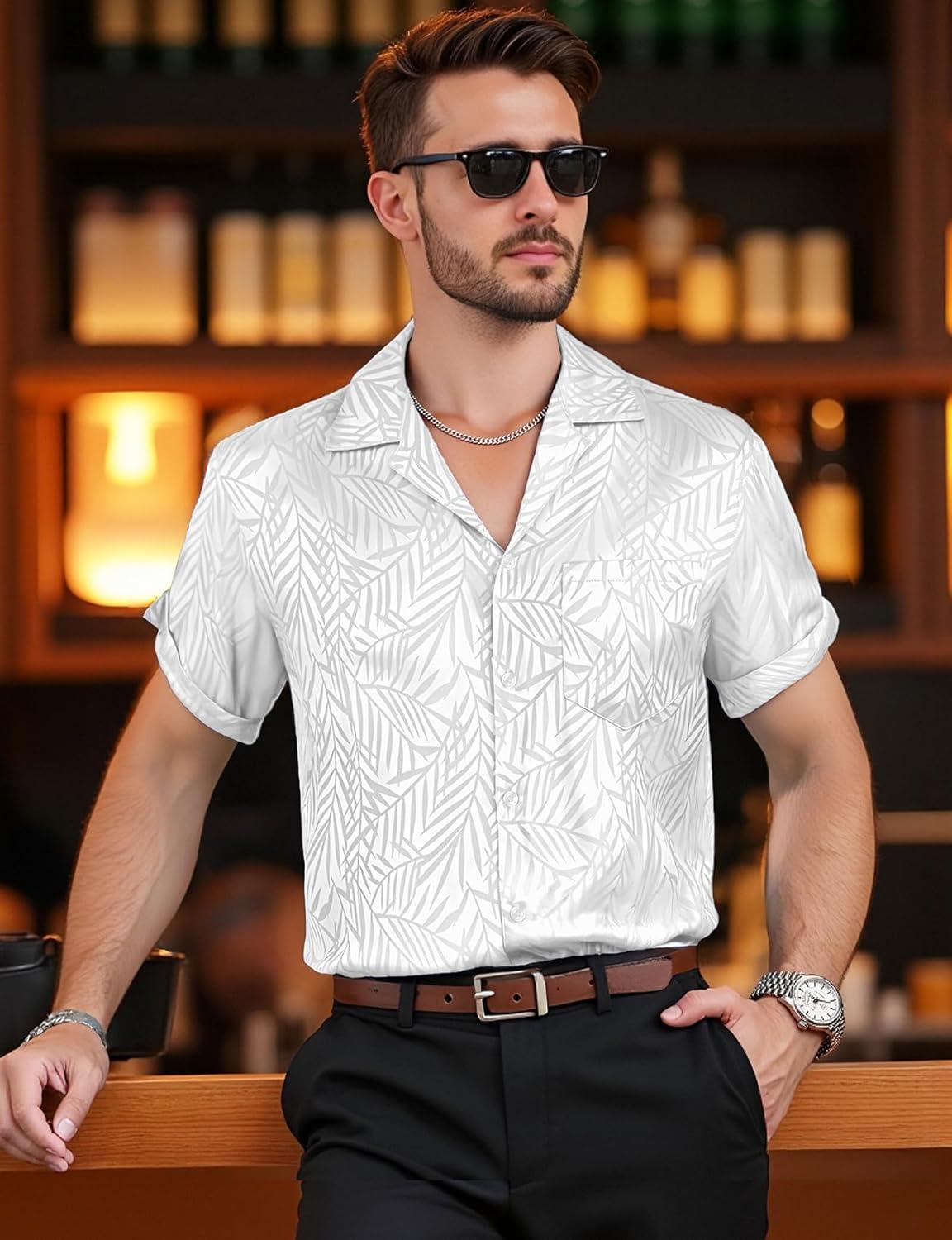 Mens Shiny Satin Silk-Like Designer Shirt Summer Regular Fit Short Sleeve Button Up Floral Shirt with Pocket(White)