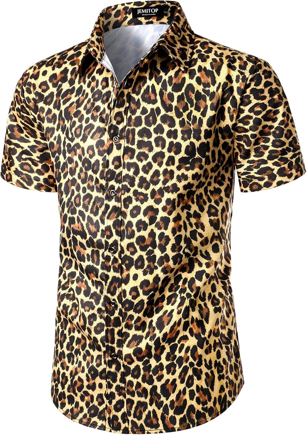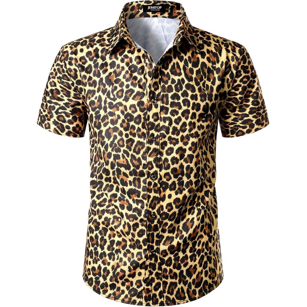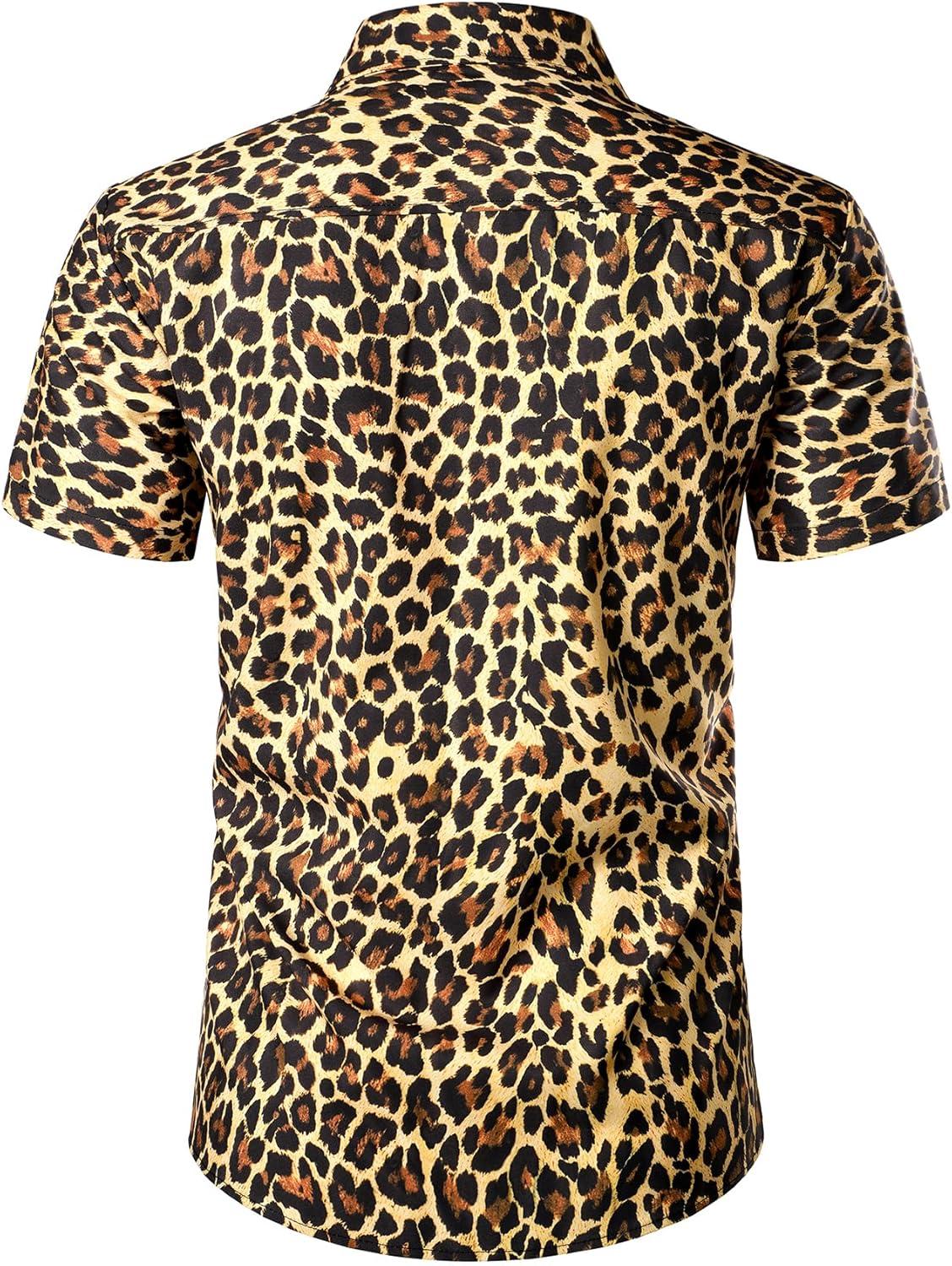 Men’s Stretchy Causal Leopard Cheetah Print Short Sleeve Slim Fit Button Up Shirt(Gold Cheetah)